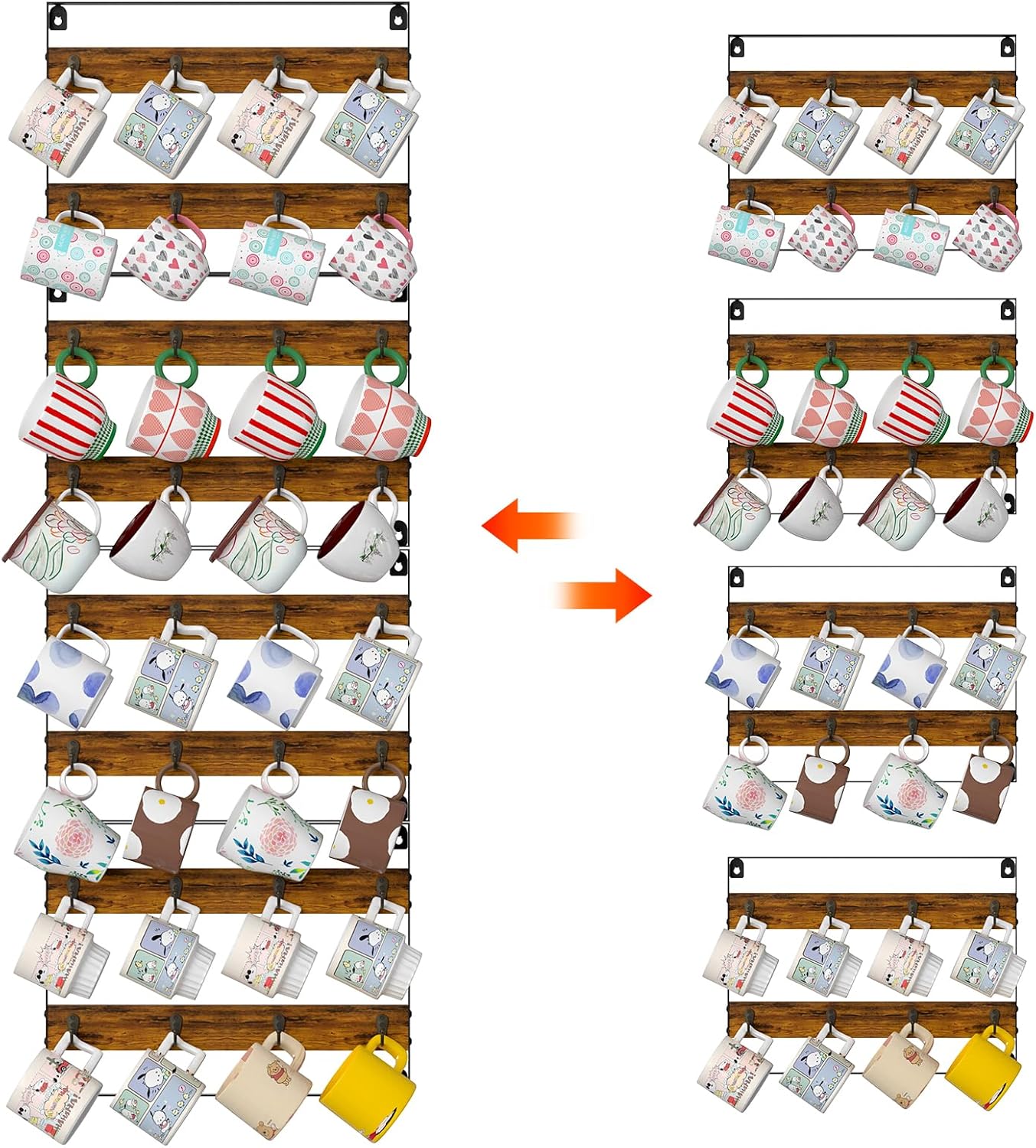 - 【4-Pack Combination】Free combination according to your needs and space. Each coffee mug wall rack has 2 layers with 8 coffee cup hooks, four mug racks total and you can hold 32pcs mugs.