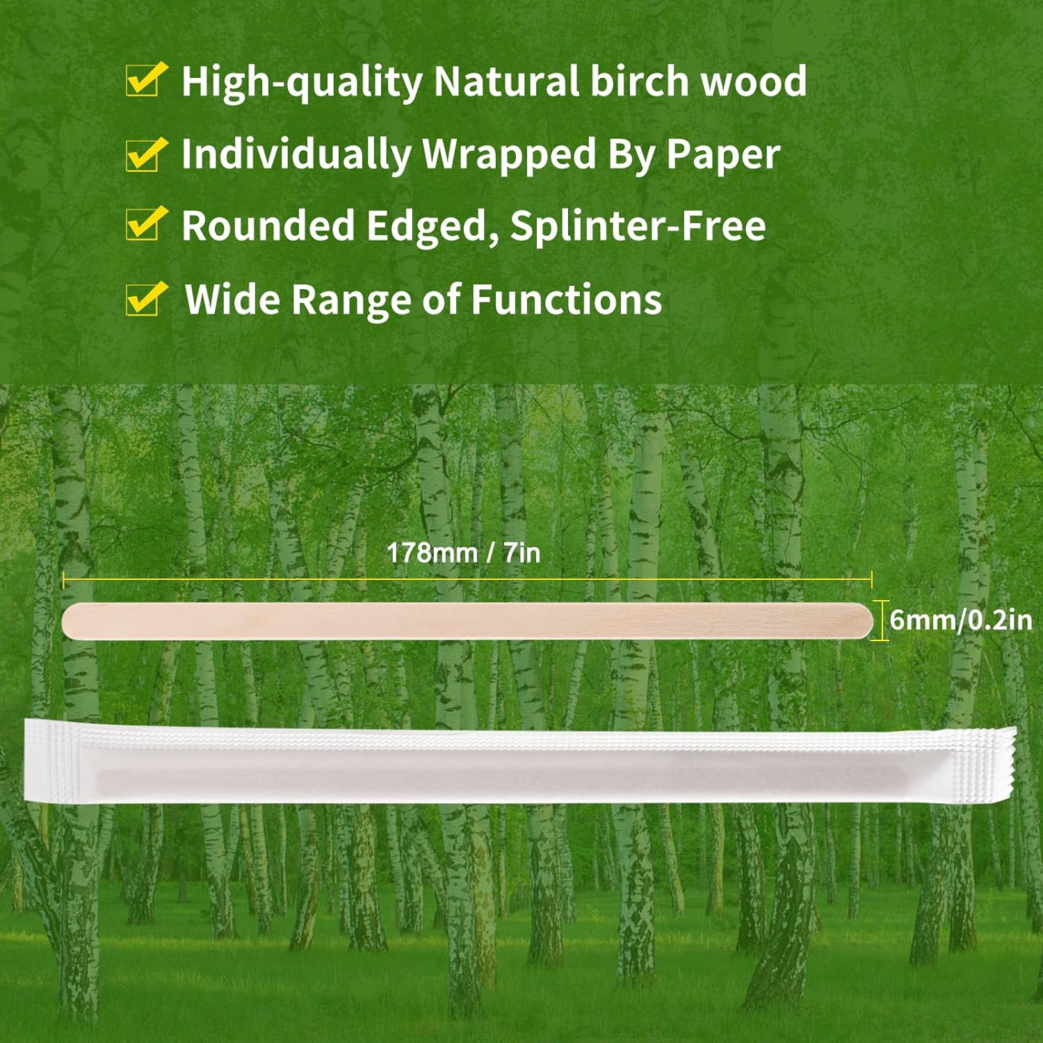 200pcs Individually Wrapped Coffee Stirrers Wood - 7" Coffee Stir Sticks, Round End Disposable coffee stirrer, For Coffee, Cocktail and Hot Drinks