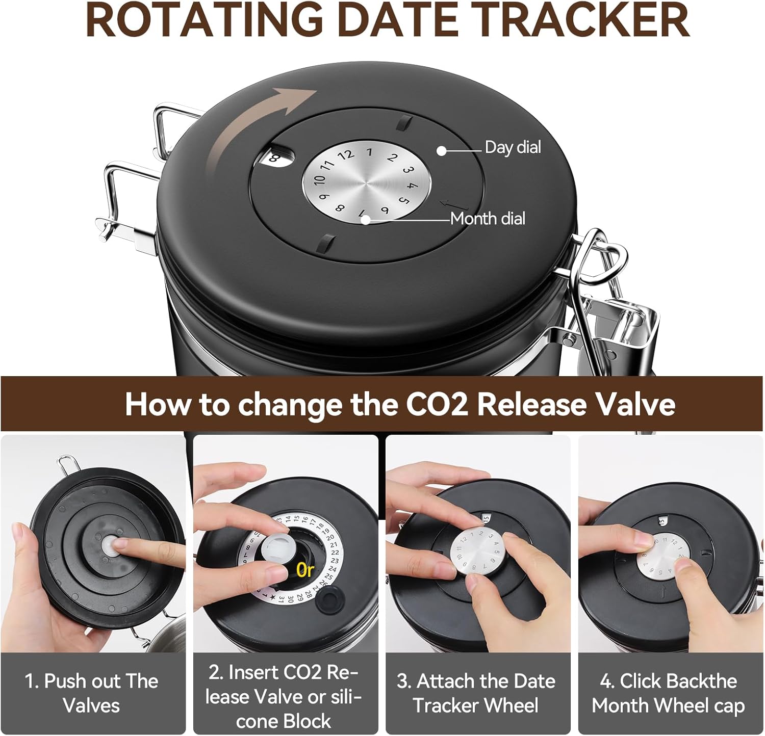 - Date Tracking Design & Bonus Scoop: Our coffee jar storage container has a date tracker and a coffee measuring scoop. The calendar date dial on the top of the lid makes it easy to keep track of the storage date or expiration date of the corresponding food item. It helps you track the freshness of your coffee. In addition, the stainless steel coffee measuring scoop accessories can be easily hung on the side of the coffee jar for ease of use
