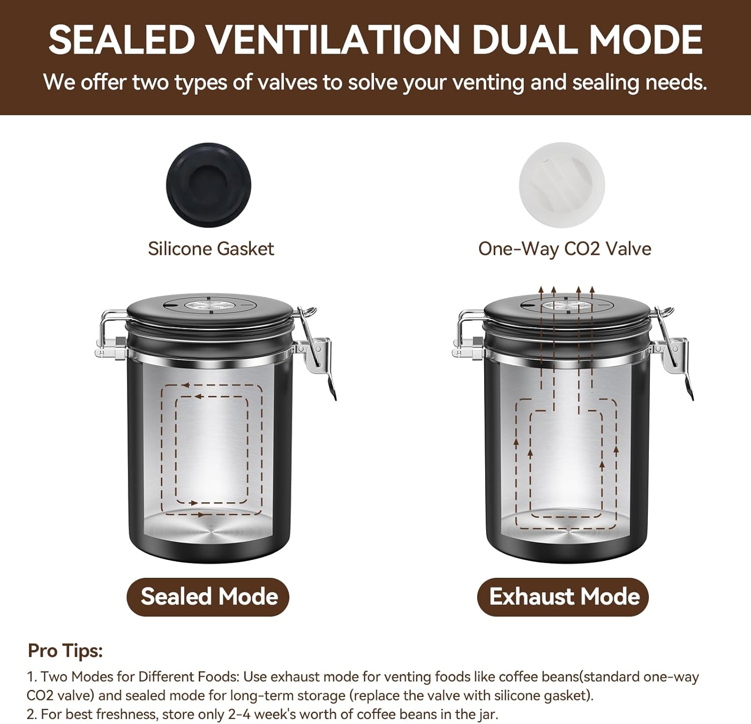 - Widely Used: The Food Container can not only store coffee beans but also coffee grounds, tea, sugar, salt, snacks, cookies, etc. It is suitable for various occasions such as coffee shops, homes, offices, kitchens, etc. For items needing ventilation, use the standard one-way CO2 valve (Exhaust Mode). For long-term storage, replace the valve with the included silicone gasket for a tighter seal (Sealed Mode)