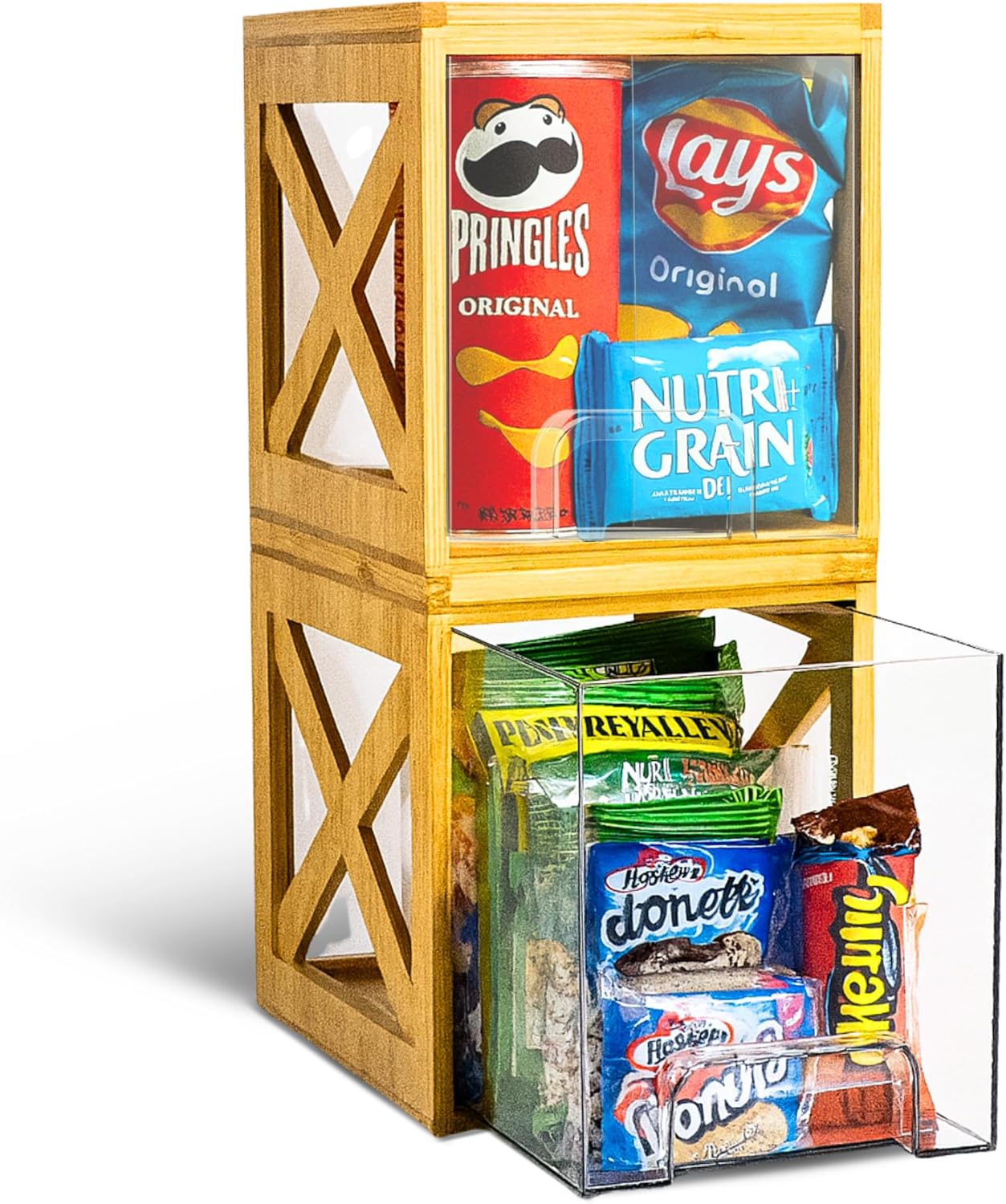 - 1. 2-PACK BAMBOO STACKABLE DRAWERS – SNACK & PANTRY ORGANIZER FOR COUNTERTOP USE A décor solution for your kitchen, snack pantry organizer and storage needs. Each bamboo countertop organizer stores cookies, cans, cocoa or tea bags. As Coffee Pod holder both drawers can store up to 52 K-Cups or 90 Nexpreso pods.