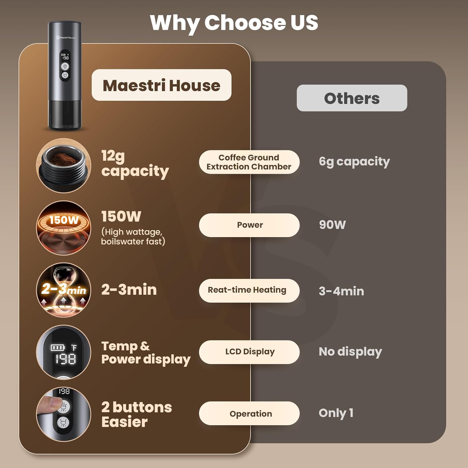 - One-touch Operation to Make Coffee: This portable electric espresso machine is easy to operate to make coffee quickly and conveniently. Just press the hot/cold brewing button for 3s, the coffee machine is turned on. It takes 2-3 minutes to fast self heat when you use cold water and choose hot brewing mode. You can get the aromatic coffee at once if you directly use hot water and choose hot brewing mode to make it. Also it is convenient to use cold water and choose cold brewing mode to fast make coffee.
