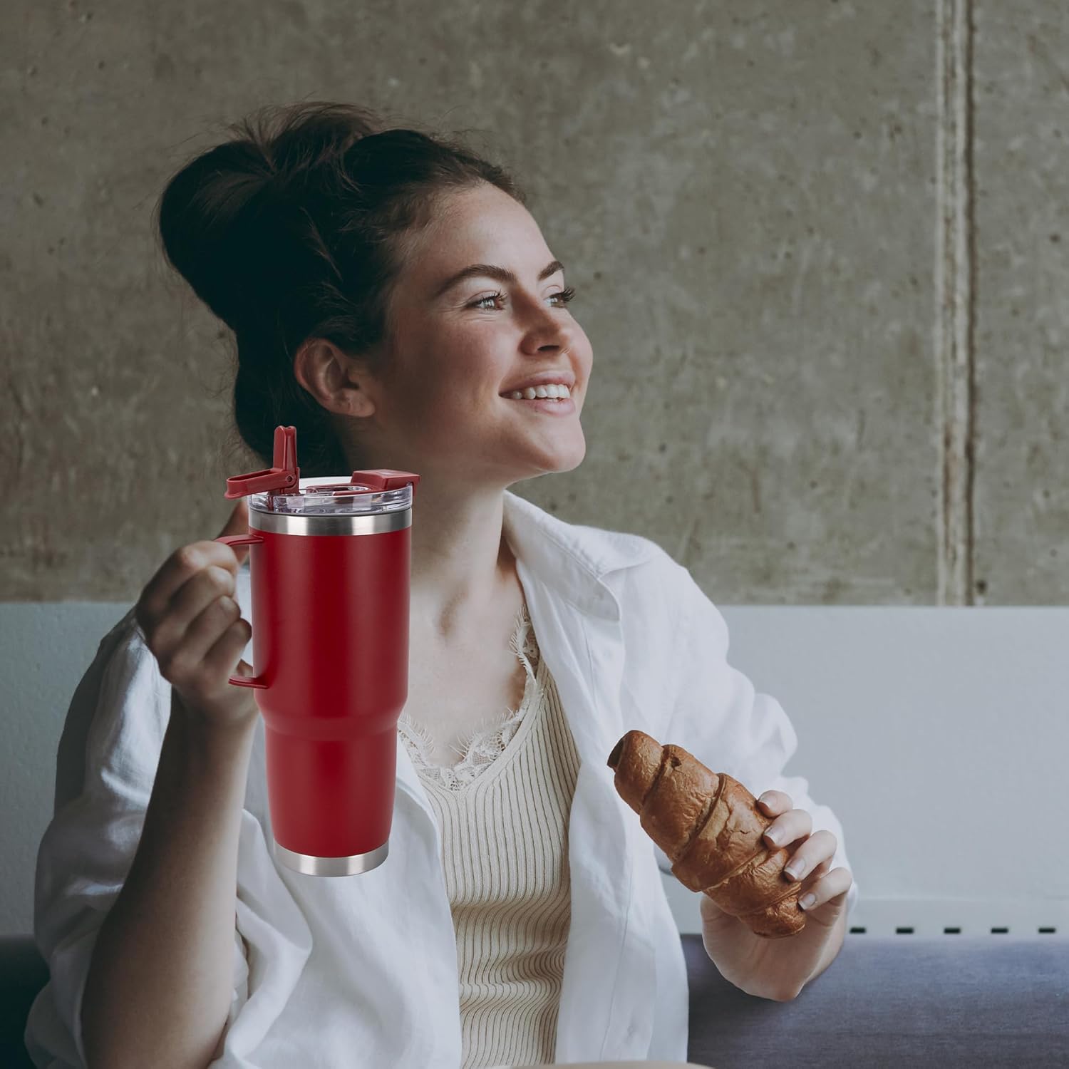 - Tumbler with handle:The welded handle provides a firm grip on your drink. It's large enough for anyone to hold easily, allowing you to carry the tumbler around and take a sip with one hand.