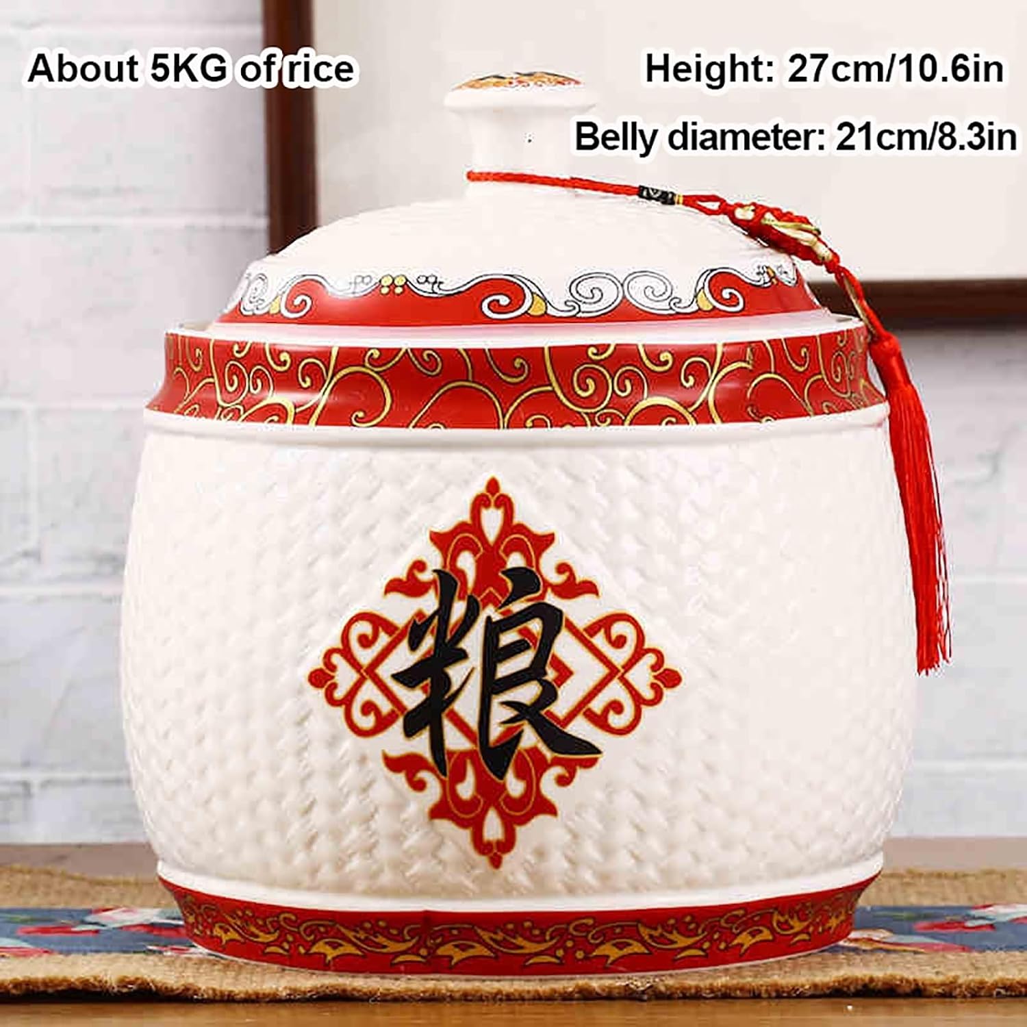 - 1. Chinese Rice tank:The Chinese style kitchen storage tank with tassel design is retro and classic; it is hand-made by various techniques such as kneading, drawing, trimming and painting; It can not only become a kitchen storage tank, but also a unique home decoration