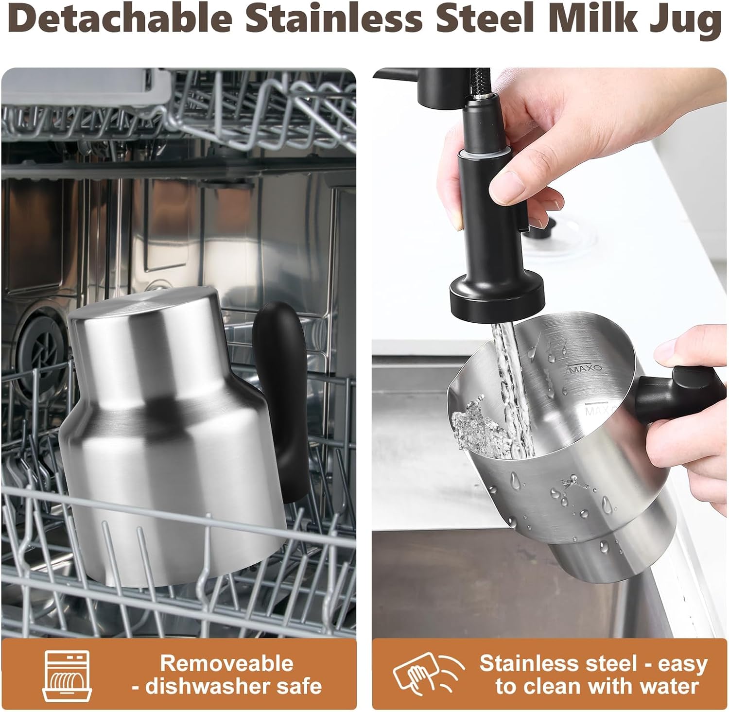 - 【Removable Design】The milk frother has a removable stainless steel jug and a 360-degree swivel base, designed for user convenience.The whisk has a magnetic attachment, making it to easy remove.