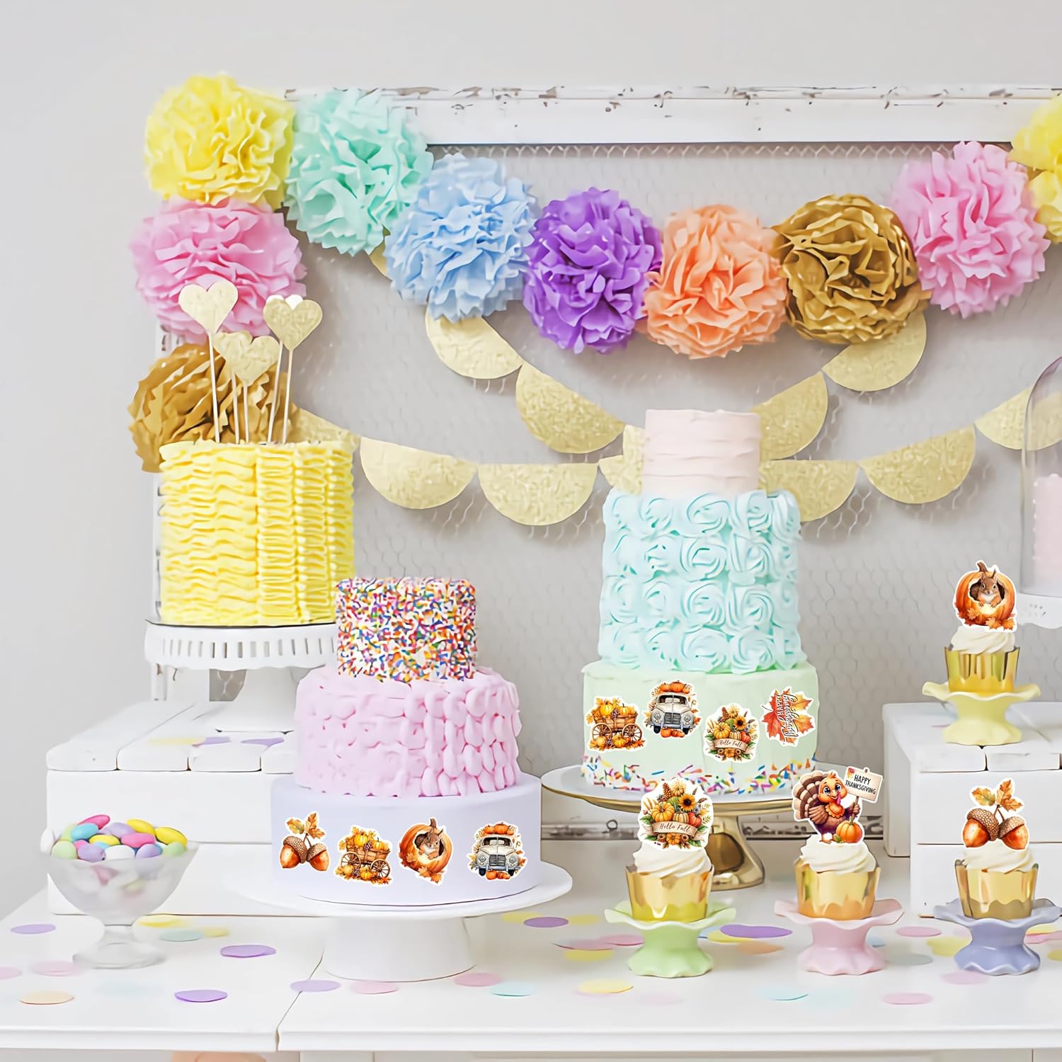 40 PCS Edible Wafer Paper Turkey Pumpkin Fall Theme Cake Picks Autumn Decorations for Thanksgiving Party