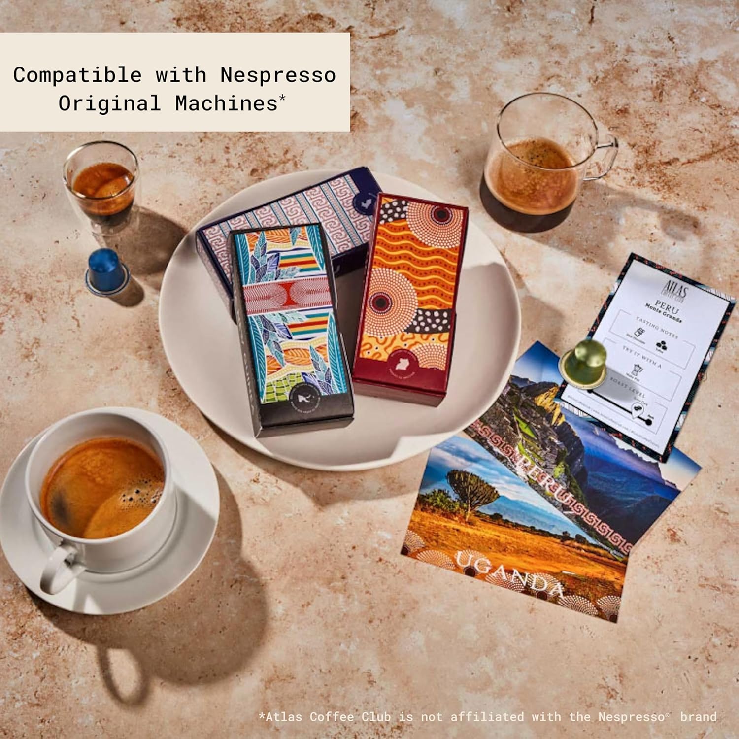 - ENJOY: 40 Atlas Coffee Club espresso capsules (4 boxes). Compatible with: Nespresso Original Machines*, Essenza Mini, Essenza Plus, Pixie, CitiZ, Lattissima, KitchenAid, and Creatista Nespresso Original machines.* Not compatible with Nespresso Vertuo machines. *Atlas Coffee Club is not affiliated with the Nespresso brand
