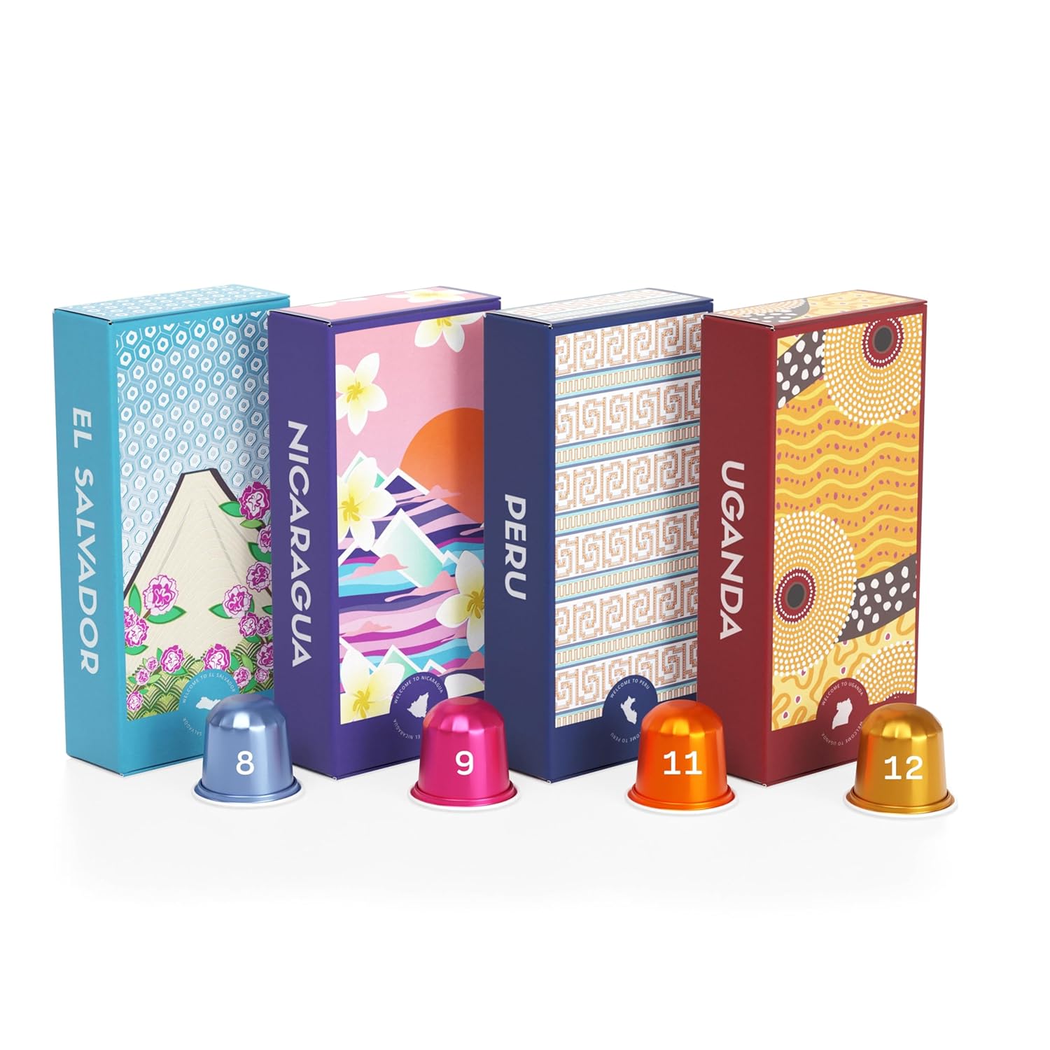 Atlas Coffee Club Espresso Pods Compatible with Nespresso Original– All Roast Variety Pack (40 Count)– Aluminum Capsules from El Salvador, Nicaragua, Peru & Uganda– Intensity 8-12