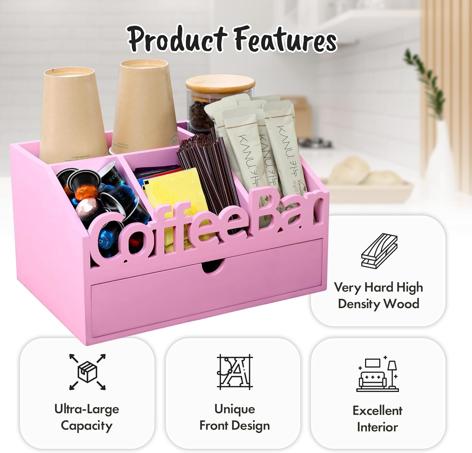 Coffee Bar Organizer for Countertop – Wooden Coffee Station with Black Drawer, Tea and K Cup Storage Rack, Coffee Pod Holder for Home and Office Counter Organization (Drawer - Pink)