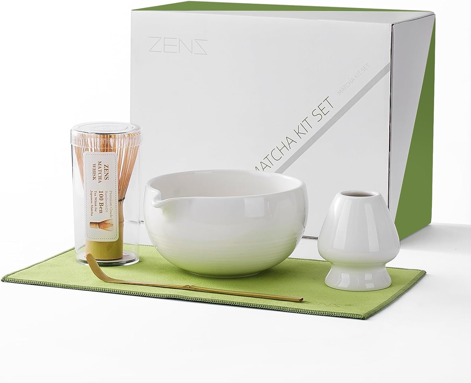 ZENS Matcha Whisk Set, 15oz Ceramic Matcha Bowl with Spout and Bamboo Whisk, Whisk Holder (Chasen), Scoop & Tea Towel, 5pcs Matcha Tea Kit Gift for Matcha Lovers, White