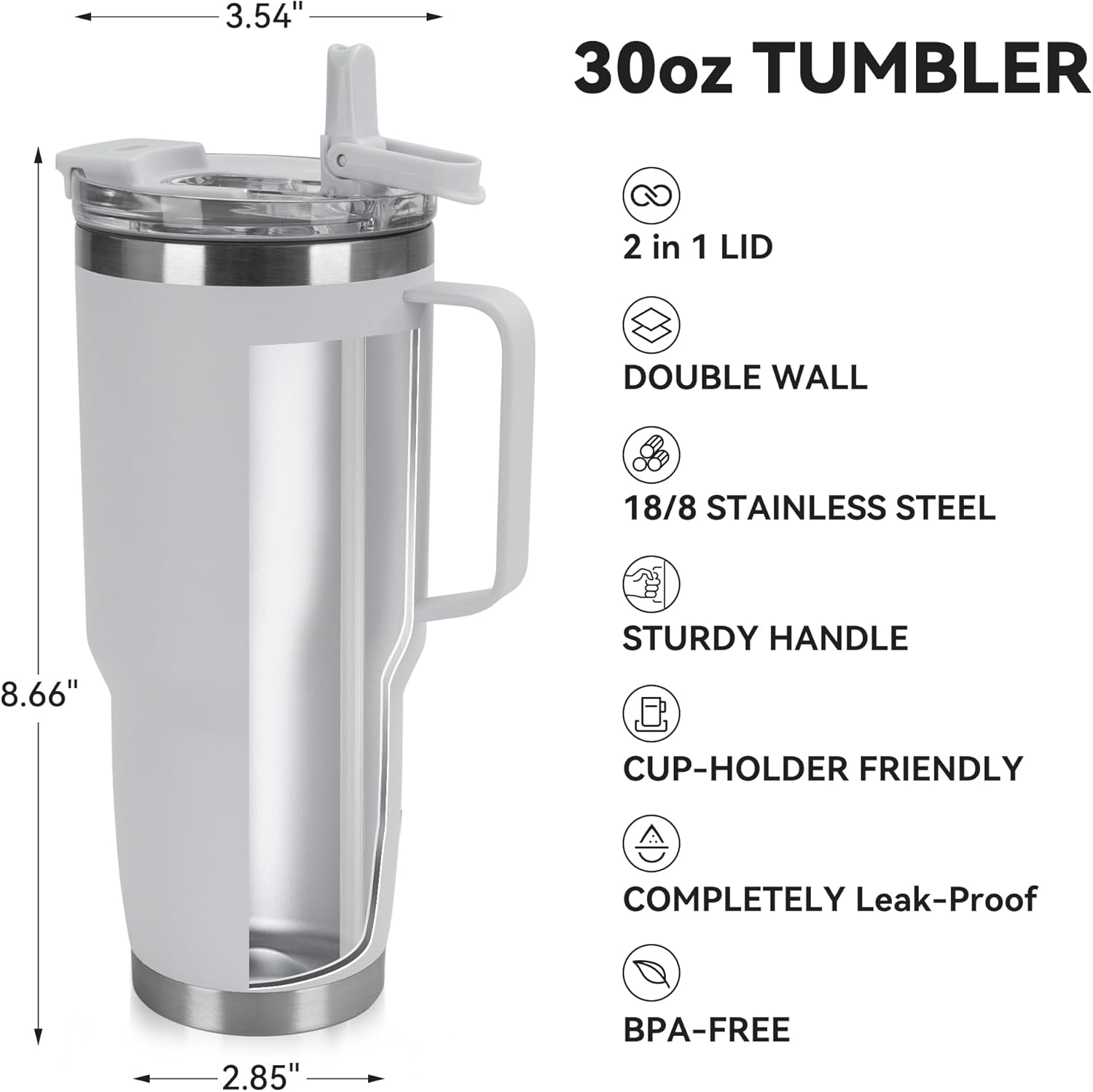 - Double Wall Vacuum Mugs: The 30 oz tumbler is made of 18/8 food-grade stainless steel,Insulated tumbler is double-walled and vacuum keeps iced for 12h, hot for 8h.