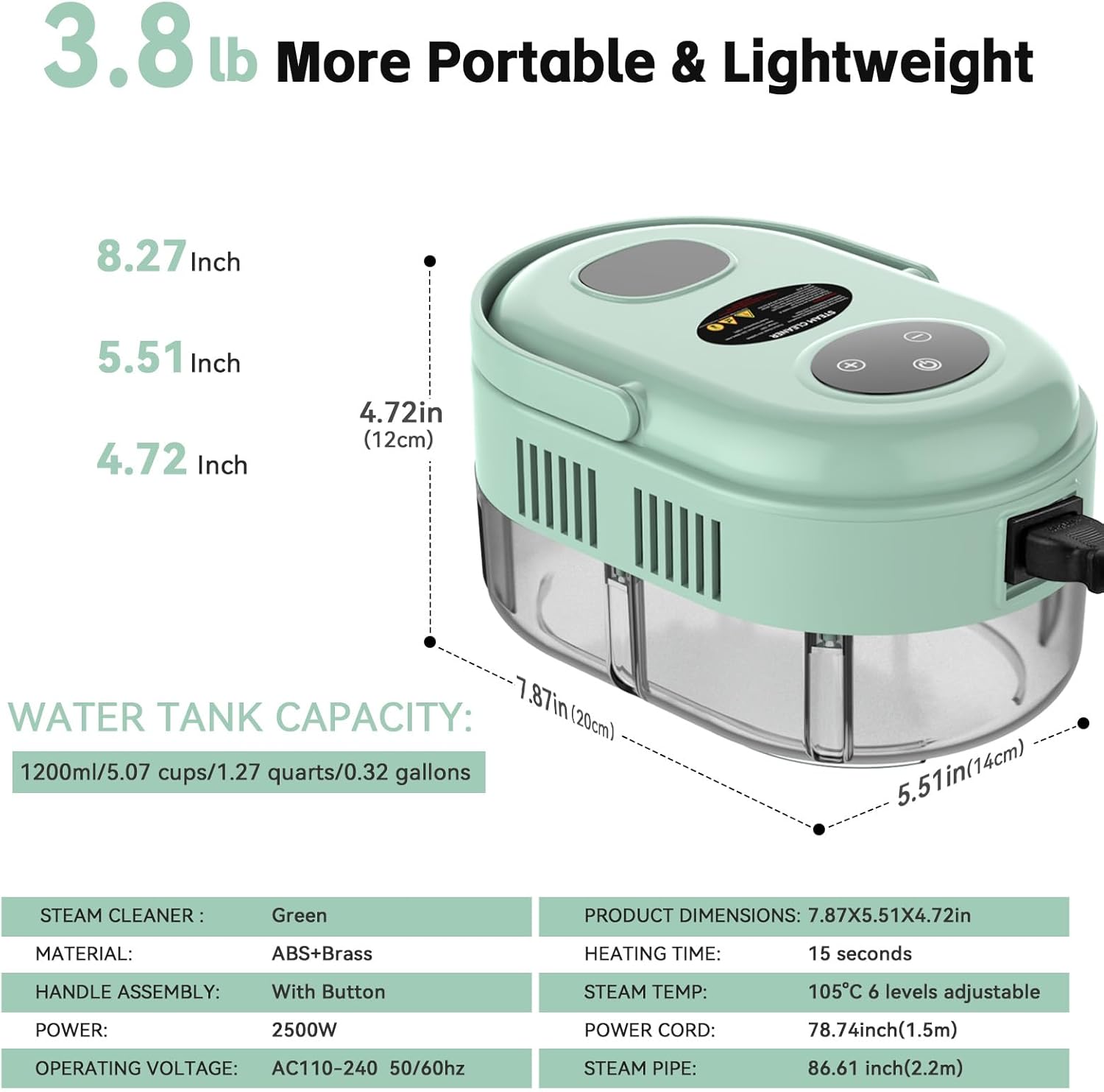 Steam Cleaner, Handheld 2500W Pressurized Heating Steamer for Cleaning,Multi-Purpose Steamer for Home Use with Water Tank, Steam Cleaner for Dirt, Grease,Grout,Tile, Floor,Couch,Car,Green