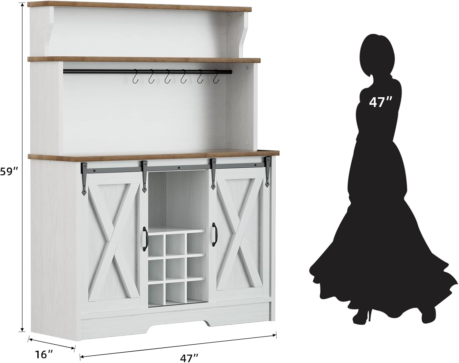 Farmhouse Coffee Bar Cabinet with 3 Tier Storage Hutch, 47'' Coffee Bar Station with Sliding Barn Door, Hutch Storage Cabinet with 9 Wine Racks & 9 Hooks for Kitchen Dining Living Room