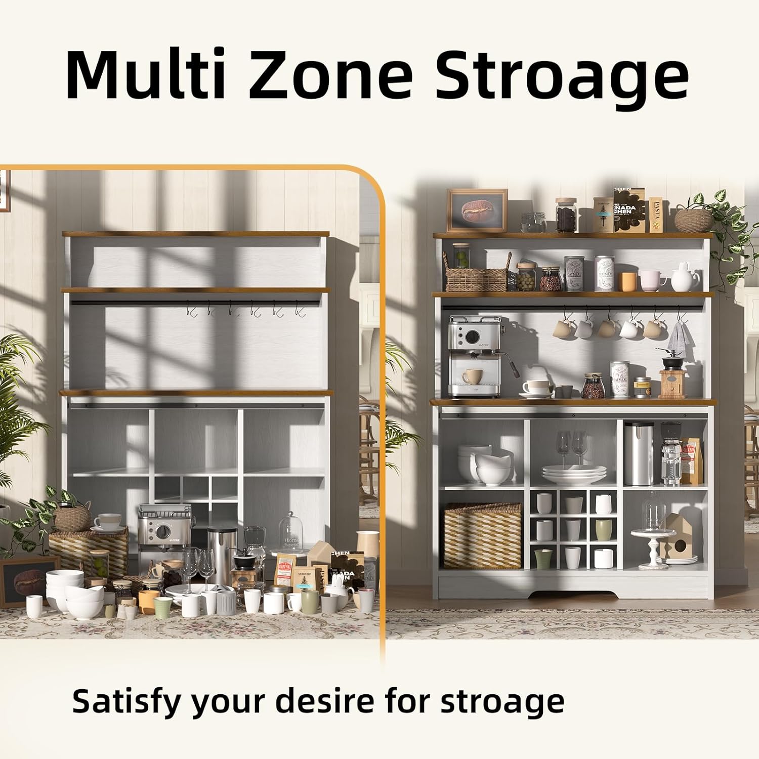 - [Multifunctional Use]: This coffee station allows you to stylishly display and store your coffee mugs and stemware. It also can serve as a wine bar cabinet, coffee bar, home bar, sideboard, TV bar, and more. It is an ideal coffee bar for kitchen, living room, dining room and office.