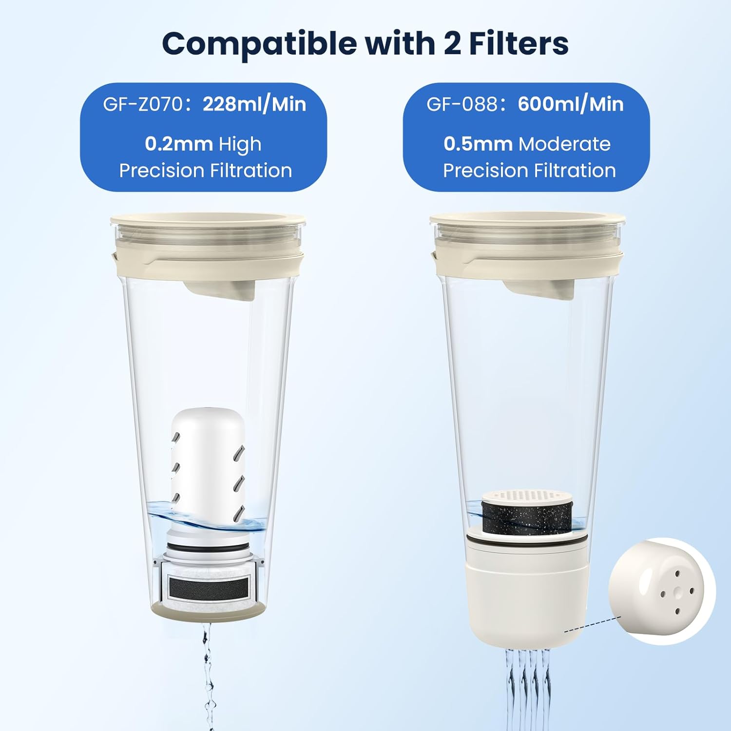 - Two Filtration Options: We provide two distinct filter to meet specific needs. For those seeking speed and enjoy refreshing water without delay, our activated carbon filtration (GF-088) is designed for a high flow rate. If you prioritize exceptional filtration, our ultrafiltration option (GF-Z070) offers a precision of 0.2 microns, ensuring that your water is not only clean but also free from impurities that can affect taste. Simply search 'GF-088' for our fast-flow solution or 'GF-Z070' for our high-precision filtration
