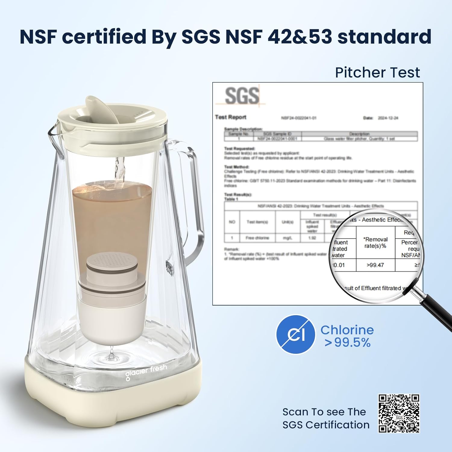 - Excellent 5-Stage filtration: This glass water filtration pitcher utilizes a comprehensive 5-stage filtration process that can effectively minimize the presence of 99% chlorine, taste&odor, PFOA&PFOS, sand, sediment and large particles.Our filtered water pitcher ensures that every sip is pure and revitalizing for you and your loved ones. To ensure you have great-tasting water, GLACIER FRESH recommend you change glass water purifier every 2 months or 40 gallons