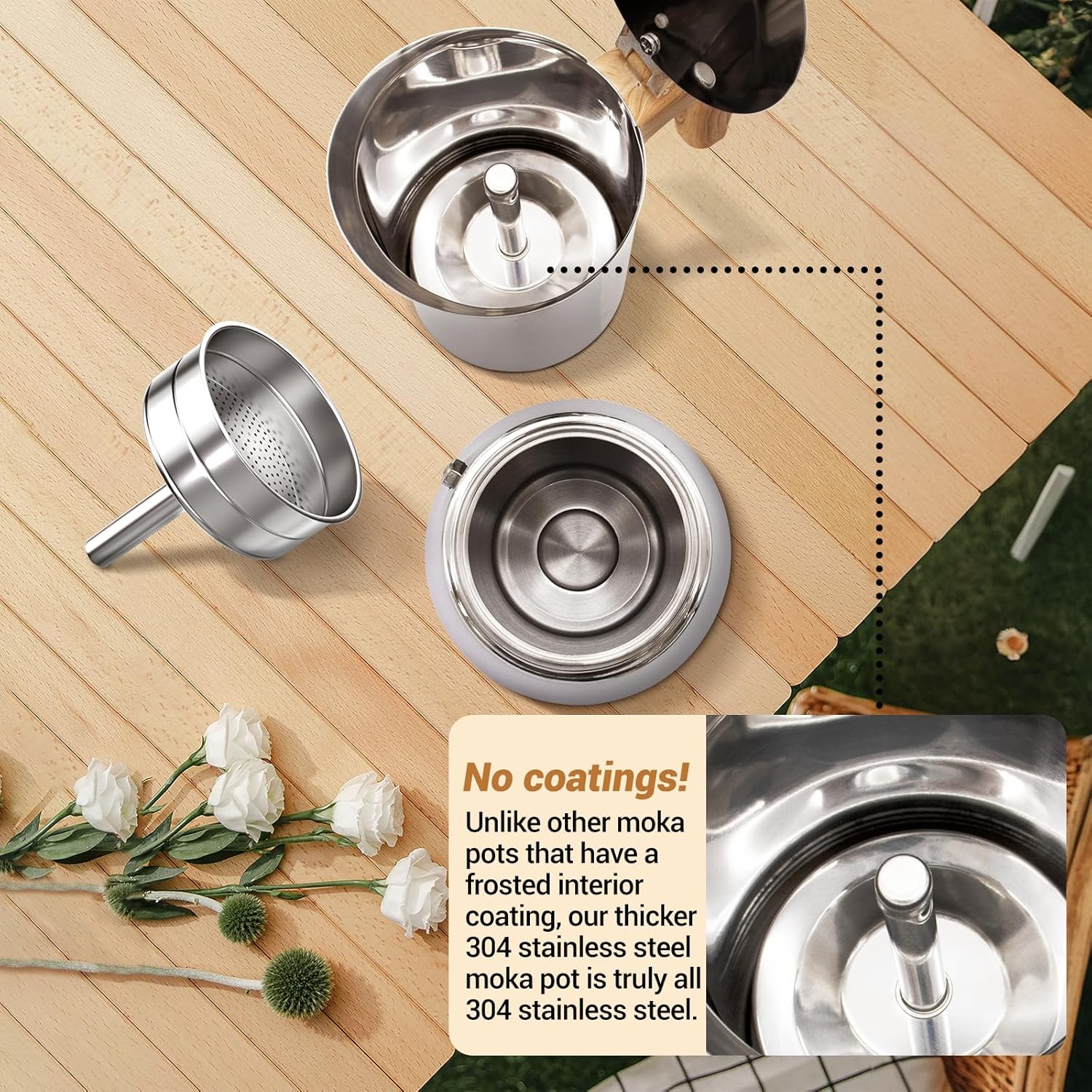 No Coating 4 Cup Moka Pot Thickened 304 Stainless Steel Stovetop Espresso Coffee Maker 200ml 6.8oz Mocha Percolator Greca Cuban Ideal for Making Rich Authentic Italian Café