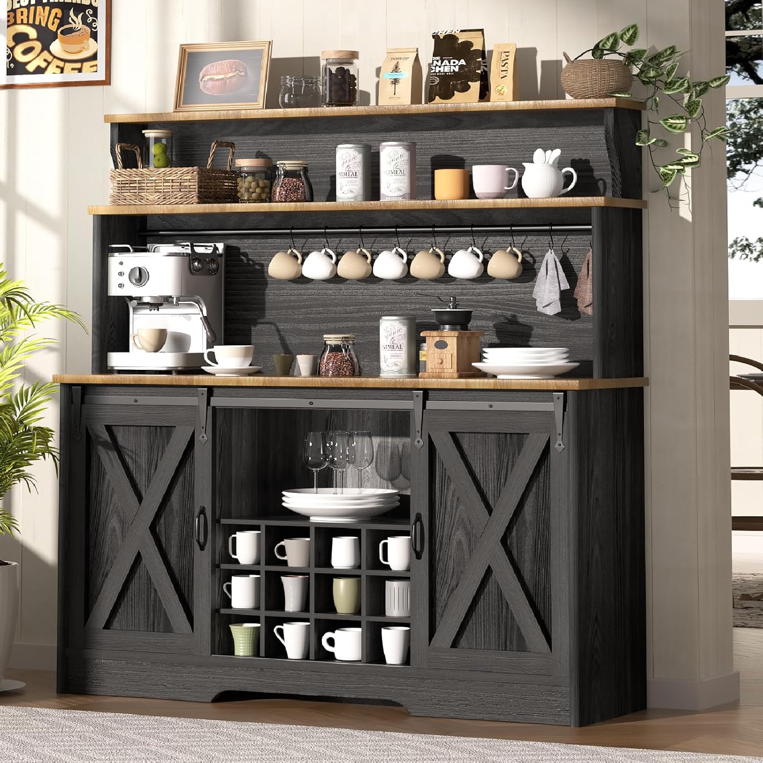 55'' Farmhouse Coffee Bar Cabinet with 3 Tier Storage Hutch, Coffee Bar Station with Sliding Barn Door, Hutch Storage Cabinet with 12 Wine Racks & 9 Hooks for Kitchen Dining Living Room