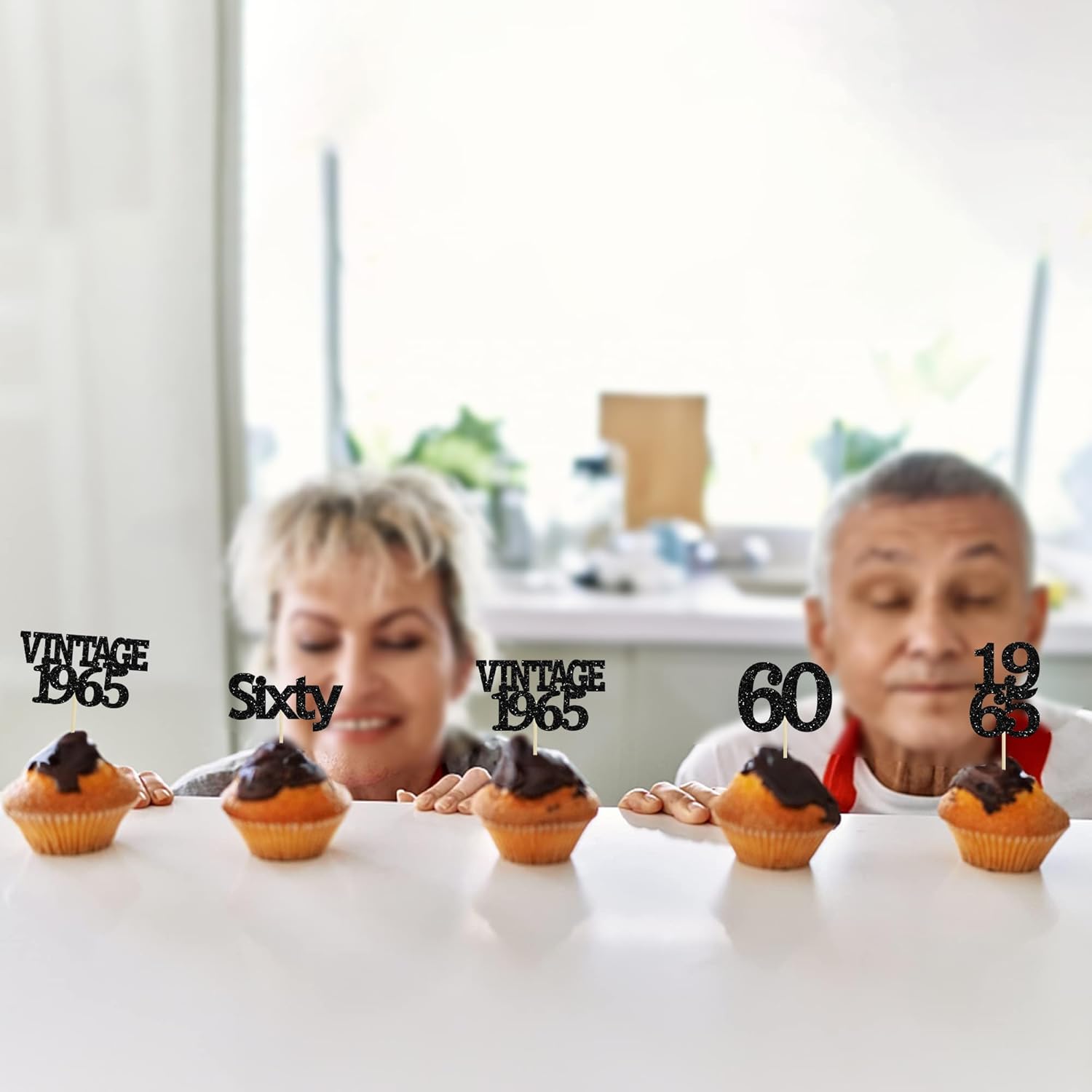 Gyufise 24Pcs Vintage 1965 Cupcake Toppers Cheers to 60 Fabulous Sixty Cupcake Picks Decorations for 60th Birthday Wedding Anniversary Party Cake Decorations Supplies Black