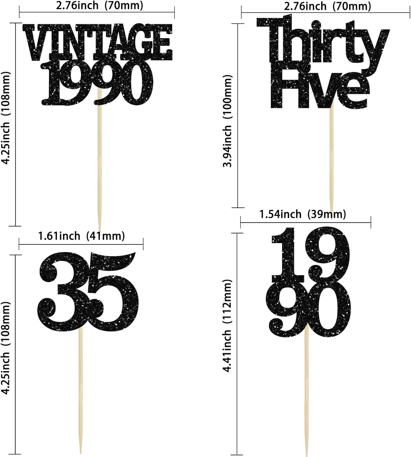 Gyufise 24Pcs Vintage 1990 Cupcake Toppers Glitter Cheers to 35 Fabulous Thirty Five Cupcake Picks 35th Birthday Wedding Anniversary Party Cake Decorations Supplies Black