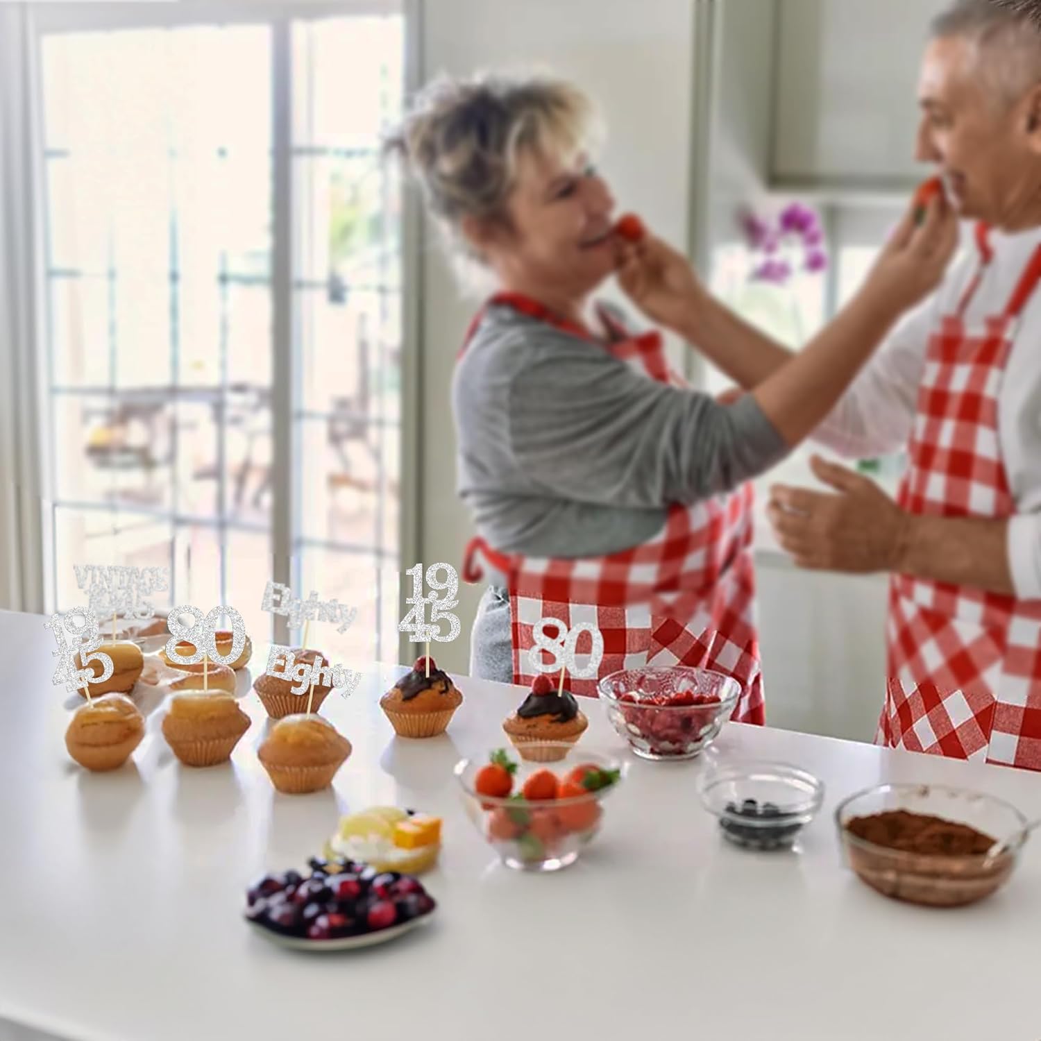 Gyufise 24Pcs 80th Birthday Cupcake Toppers Glitter Cheers to 80 Fabulous Eighty Vintage 1945 Cupcake Picks 80th Birthday Wedding Anniversary Party Cake Decorations Supplies Silver