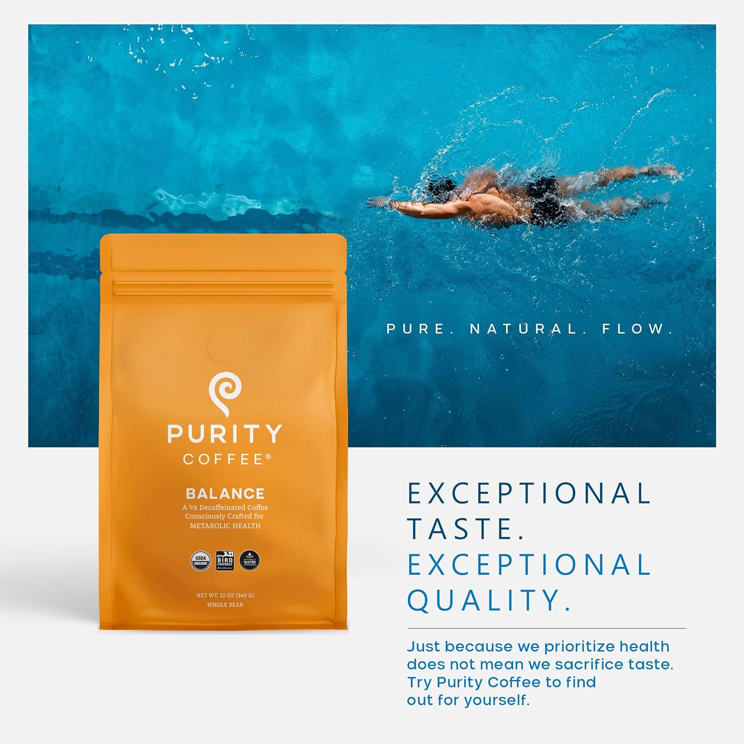 Purity Coffee BALANCE 2/3 Decaf Medium Roast Ground Coffee (12oz Bag) - Specialty-Grade Mountain Water Processed Decaf + Regular Arabica Blend- USDA Certified Organic Decaffeinated - Third Party Tested for Mold, Mycotoxins, Pesticide Residue