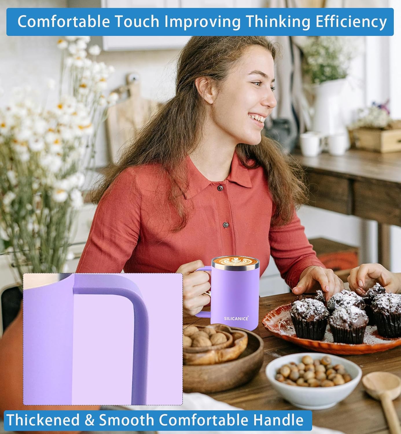 14 oz Purple Stainless Steel Coffee Mug, Reusable Travel Tumbler with Lid & Handle – Dishwasher-Safe Thermos Cup for Women, Ideal for Office/Travel Use with Hot/Cold Drinks