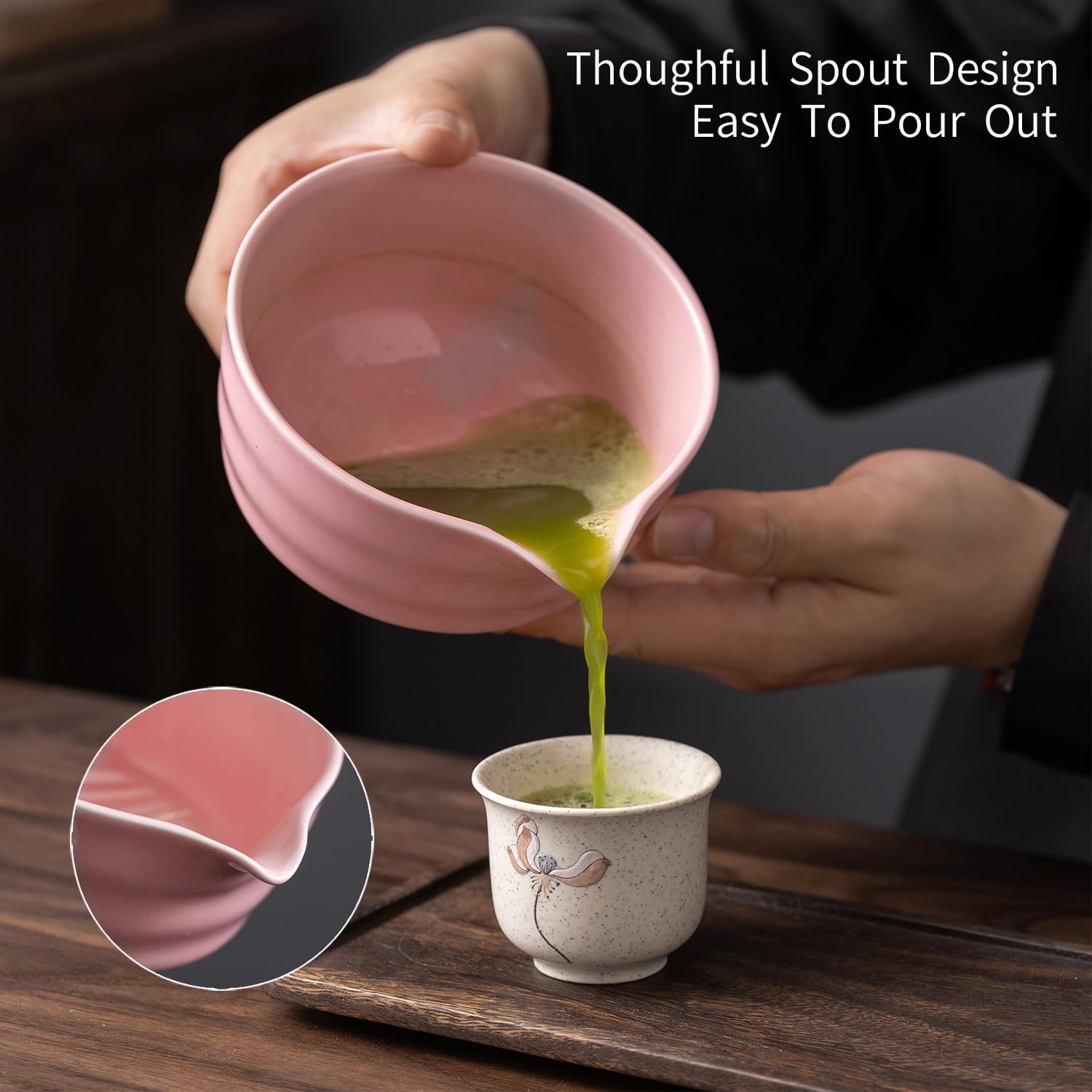 Matcha Set, Matcha Whisk Set Includes Matcha Bowl with Spout, Bamboo Whisk, Matcha Whisk Holder, Sifter, Scoop, Spoon Holder, Tea Towel- 7pcs Perfect Matcha Kit for Matcha Tea Ceremony (Pink)