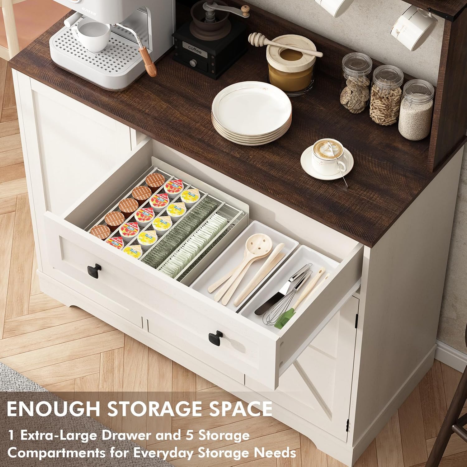 Wnutress Farmhouse Coffee Bar Cabinet with Drawer, 39" Kitchen Hutch Sideboard Buffet Cabinet with Charging Station and Adjustable Shelves, Coffee Bar Storage Table for Living Room, Antique White
