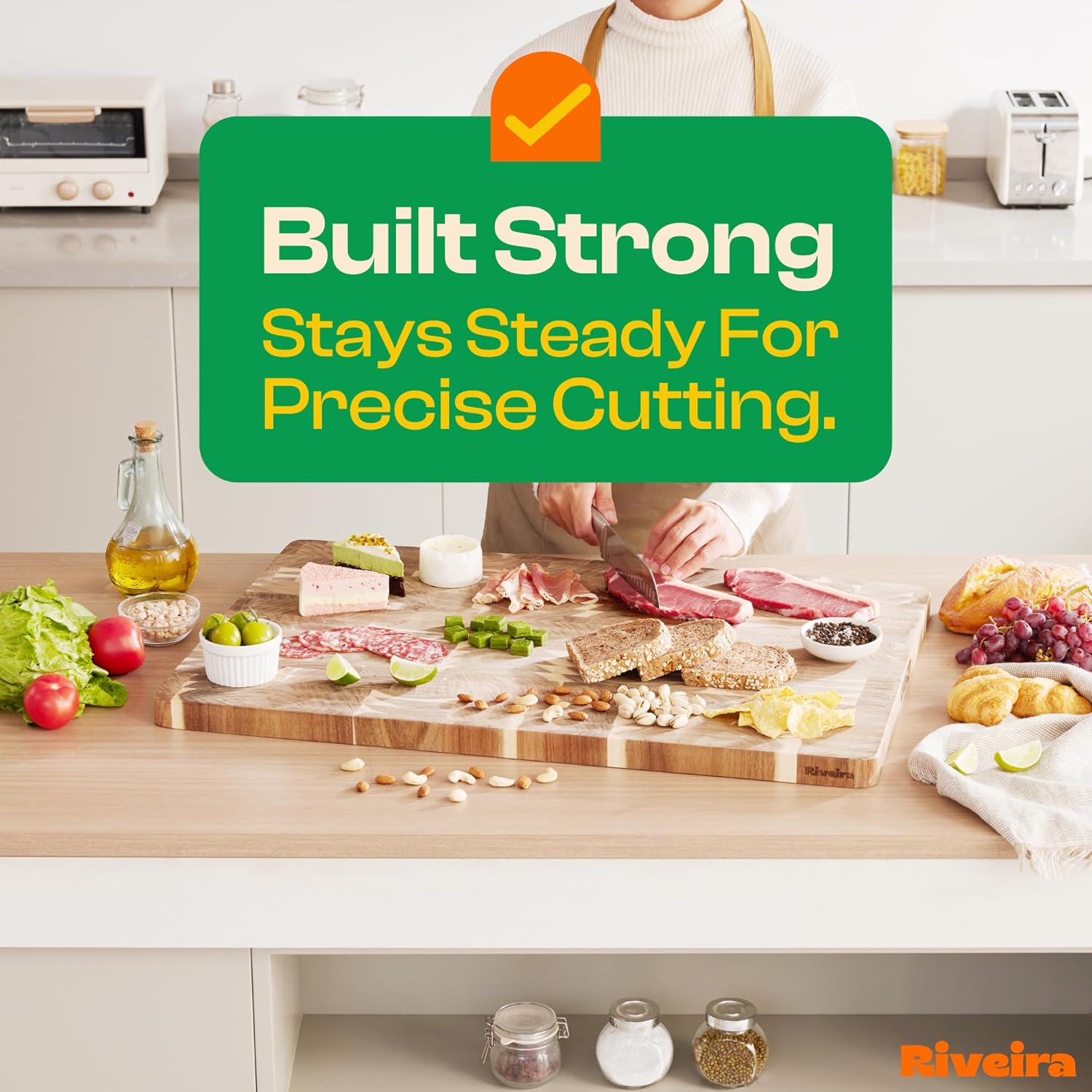 - Premium Crafted Acacia — Take a detour from traditional kitchen aesthetics with this acacia wood board crafted from 100% natural acacia. Beyond being an unconventional and eco-friendly choice, the chopping board wood proudly showcases the environment friendly and organic acacia. This wood cutting boards for kitchen counter adds an unexpected touch of confidence and style to your once-orderly culinary space. Riviera's wooden chopping boards for kitchen will be there for many years to come.