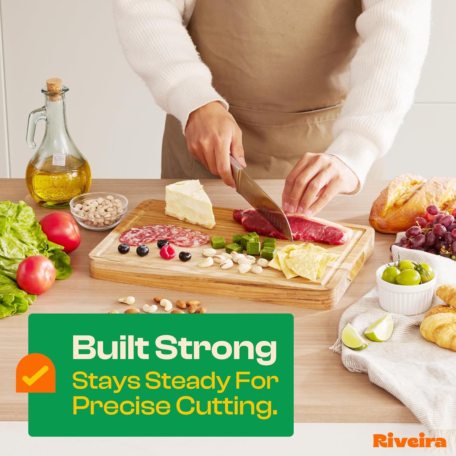 - Premium Crafted Teak — Take a detour from traditional kitchen aesthetics with this teak wood board crafted from 100% natural teak. Beyond being an unconventional and eco-friendly choice, the chopping board wood proudly showcases the environment friendly and organic teak. This wood cutting boards for kitchen counter adds an unexpected touch of confidence and style to your once-orderly culinary space. Riviera's wooden chopping boards for kitchen will be there for you for many years to come.