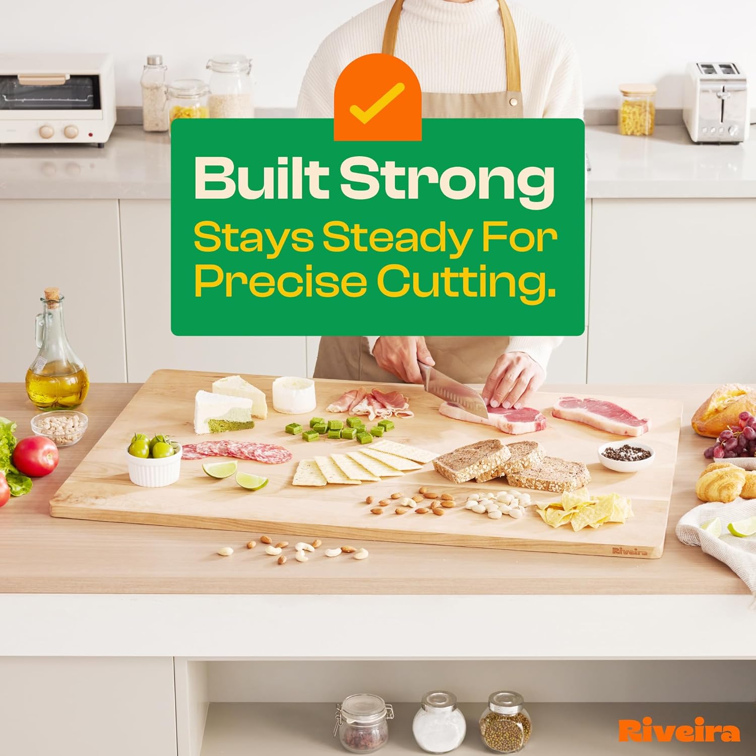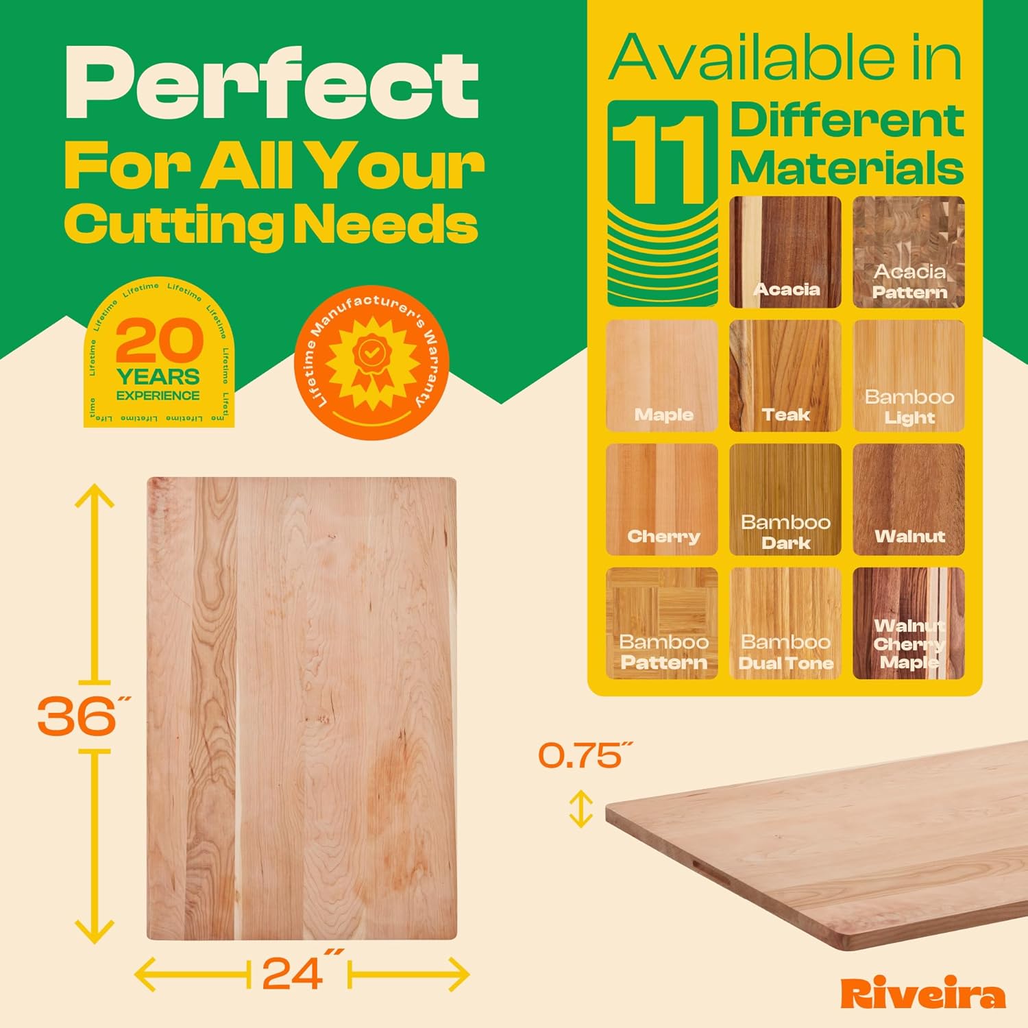 - Premium Crafted Cherry — Take a detour from traditional kitchen aesthetics with this cherry wood board crafted from 100% natural cherry. Beyond being an unconventional and eco-friendly choice, the chopping board wood proudly showcases the environment friendly and organic cherry. This wood cutting boards for kitchen counter adds an unexpected touch of confidence and style to your once-orderly culinary space. Riviera's wooden chopping boards for kitchen will be there for many years to come.