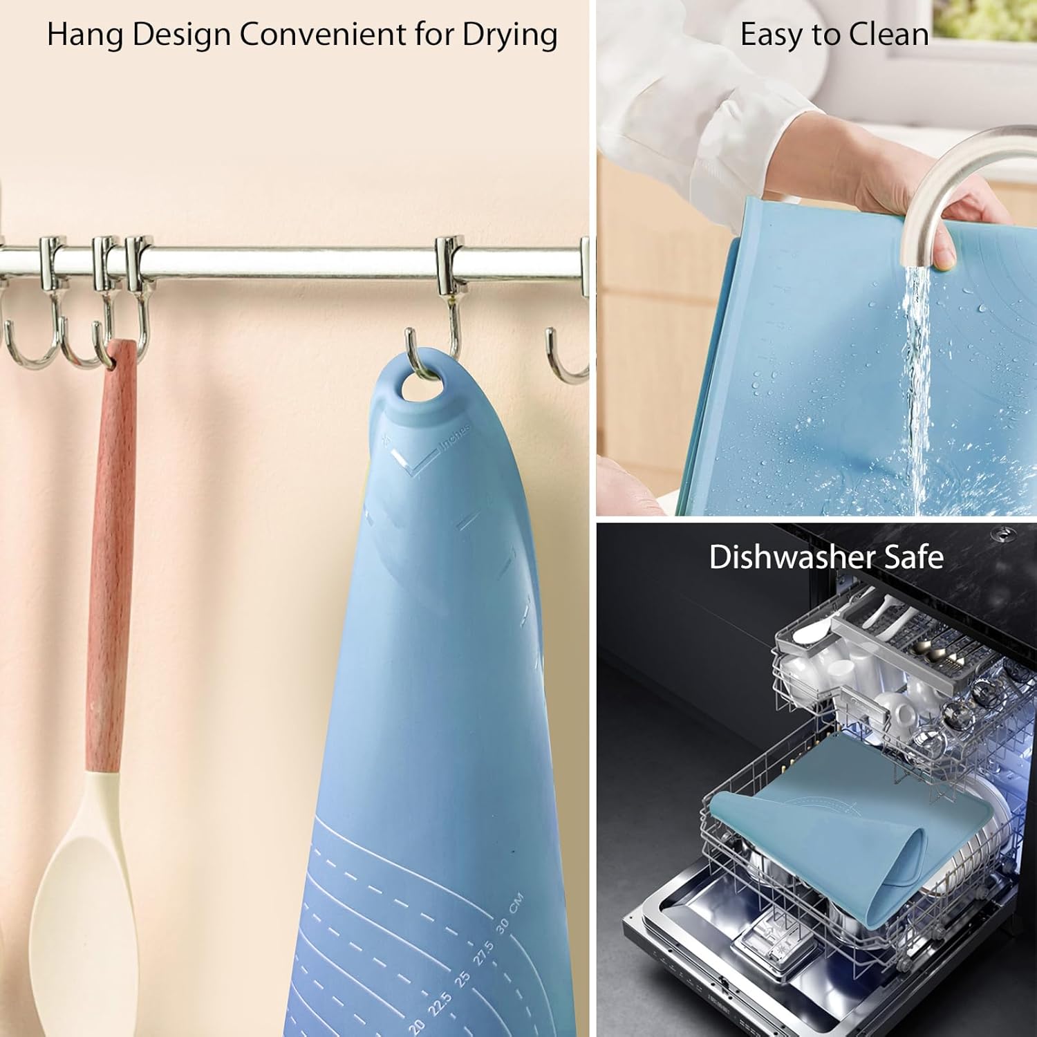 - NON-STICKY SURFACE AND ANTI-SLIP BOTTOM: Using silicone pastry mat make baking is more easy and convenient.You will enjoy the best NON-STICK baking pad. Even if grease or dough sticks to the surface, pastry mat can be easily cleaned up.This non-slip baking mat can realize complete adhesion,strongly adhesive to the countertop,won't slip and slide around.