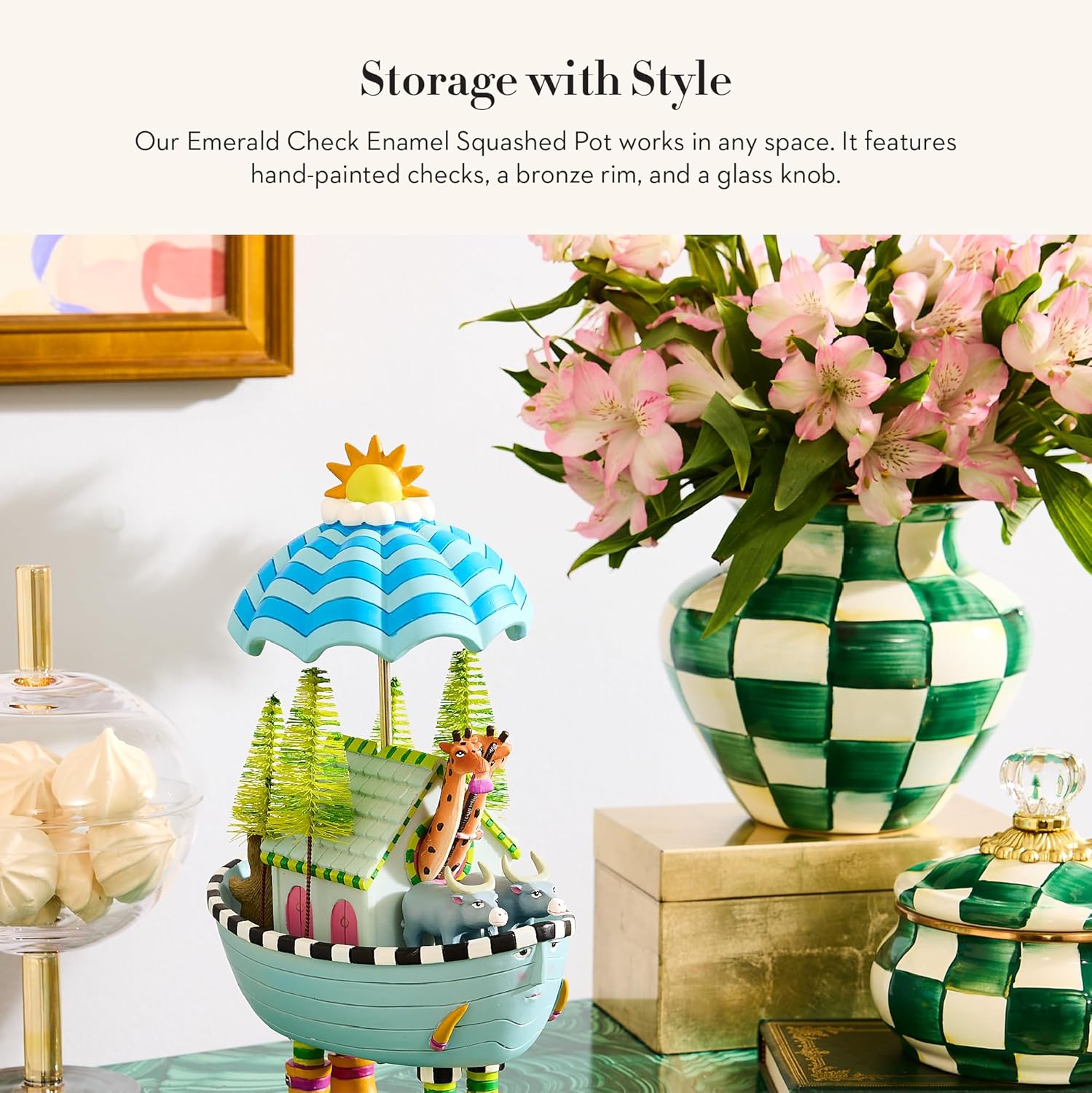- ELEGANT STORAGE ESSENTIAL: Our Emerald Check Enamel Squashed Pot offers a chubby silhouette and holds 20 oz. It features a heavy-gauge steel underbody decorated with hand-painted green-and-white checks, a bronze stainless-steel rim, and a glass knob.