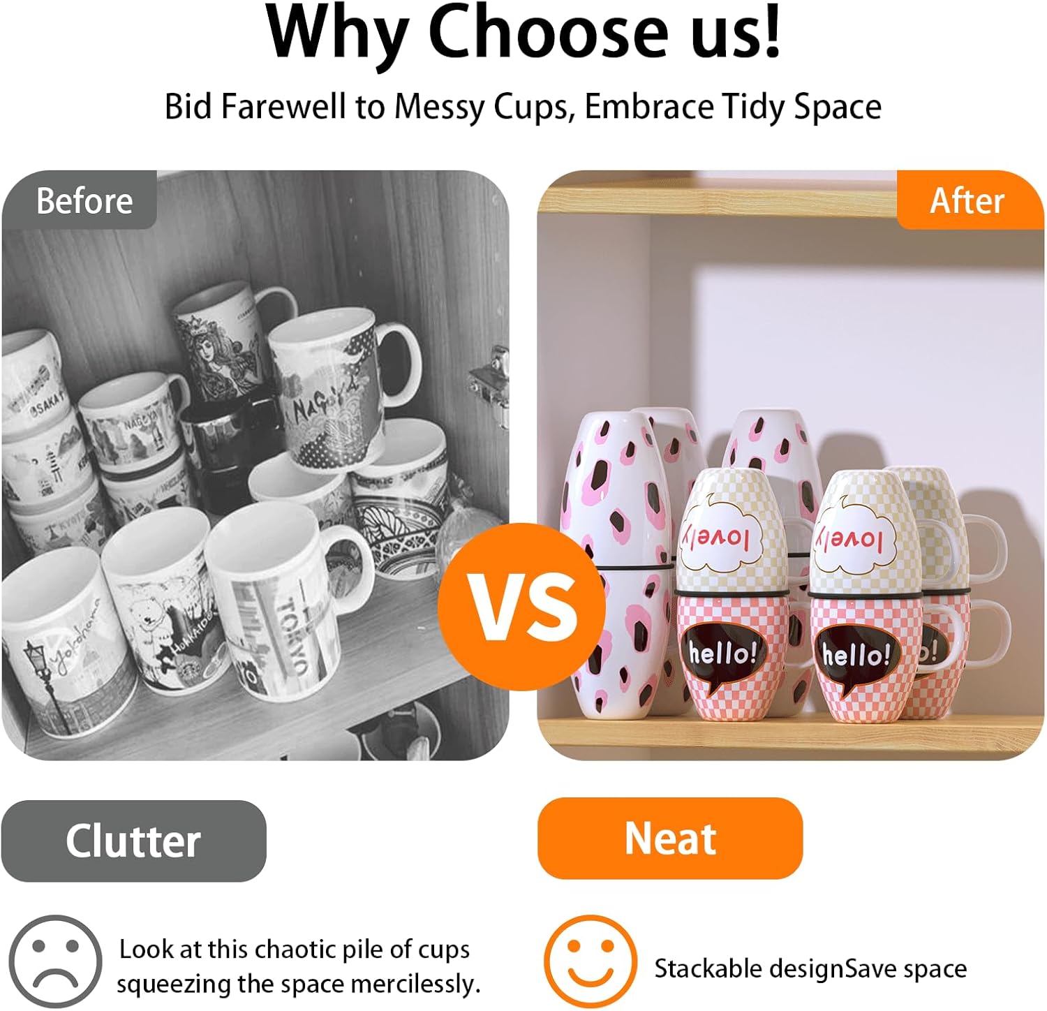- Easy to Use & Setup – Simply place one Stacker on top of a cup, then place another upside-down on top. Gently squeeze the stacker to adjust it to the size of your mugs, and you’ll have a secure and organized storage solution in no time. 🔔For use only with round-mouthed cups with diameters between 1.5-3.9" (3.8-9.9 cm)