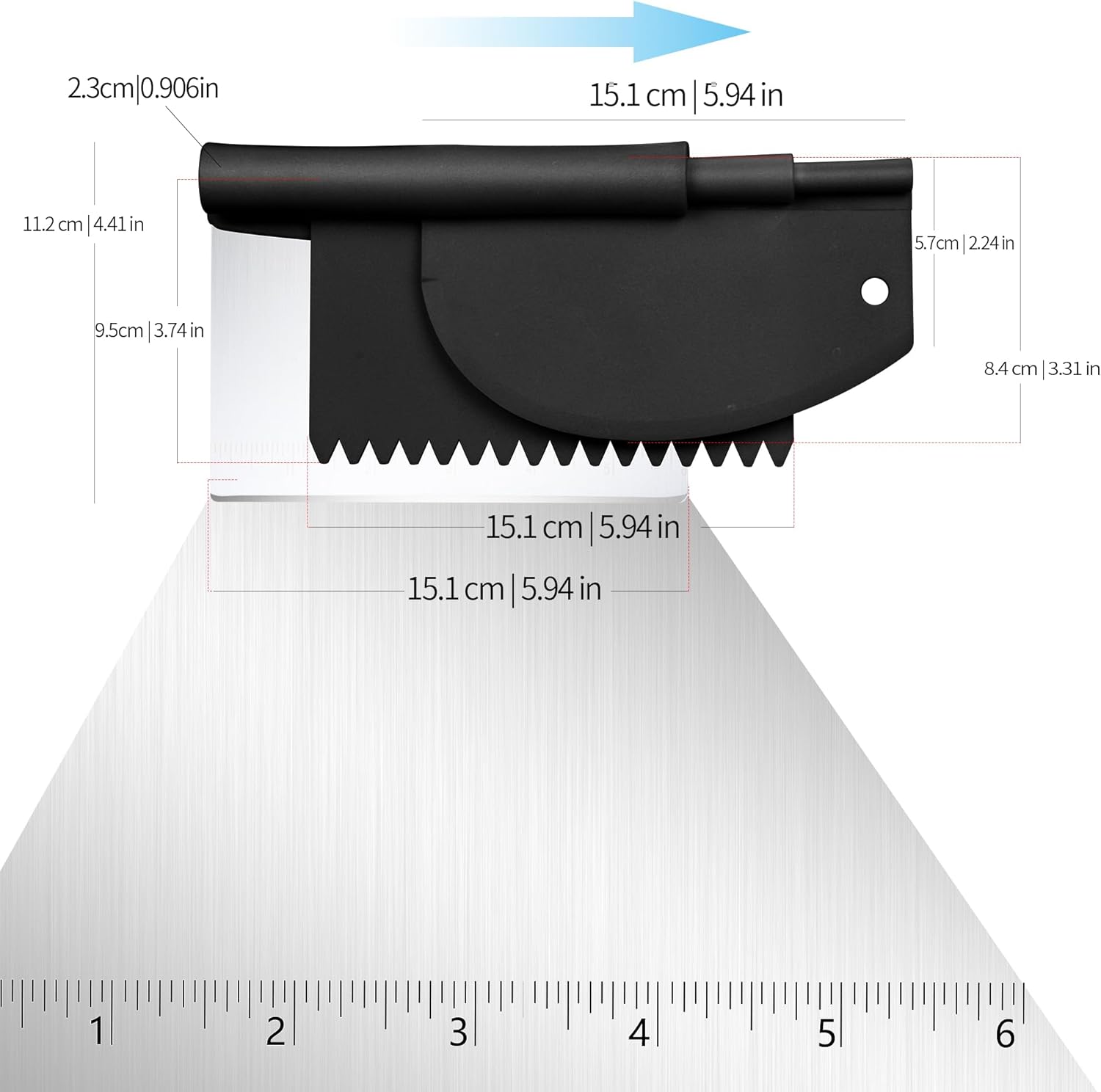 - STAINLESS STEEL BENCH SCRAPER: equipped with 430 stainless steel safety bevels blades specially designed for dough.With the clearly engraved measurement conversion table, you can quickly reference and mark up to 6 inches at any time- Precise dough cutting and dispensing is easier than ever