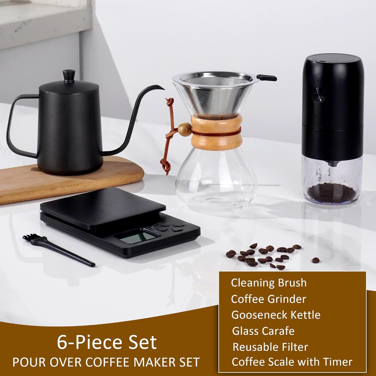- ALL-IN-1 SET: This set comes with 1pc 32oz gooseneck kettle, 1pc stainless steel coffee filter, 1pc 14oz coffee chemex server, 1pc electric coffee grinder, 1pc coffee scale. This is a great pour over coffee maker kit that is ideal for advanced users.