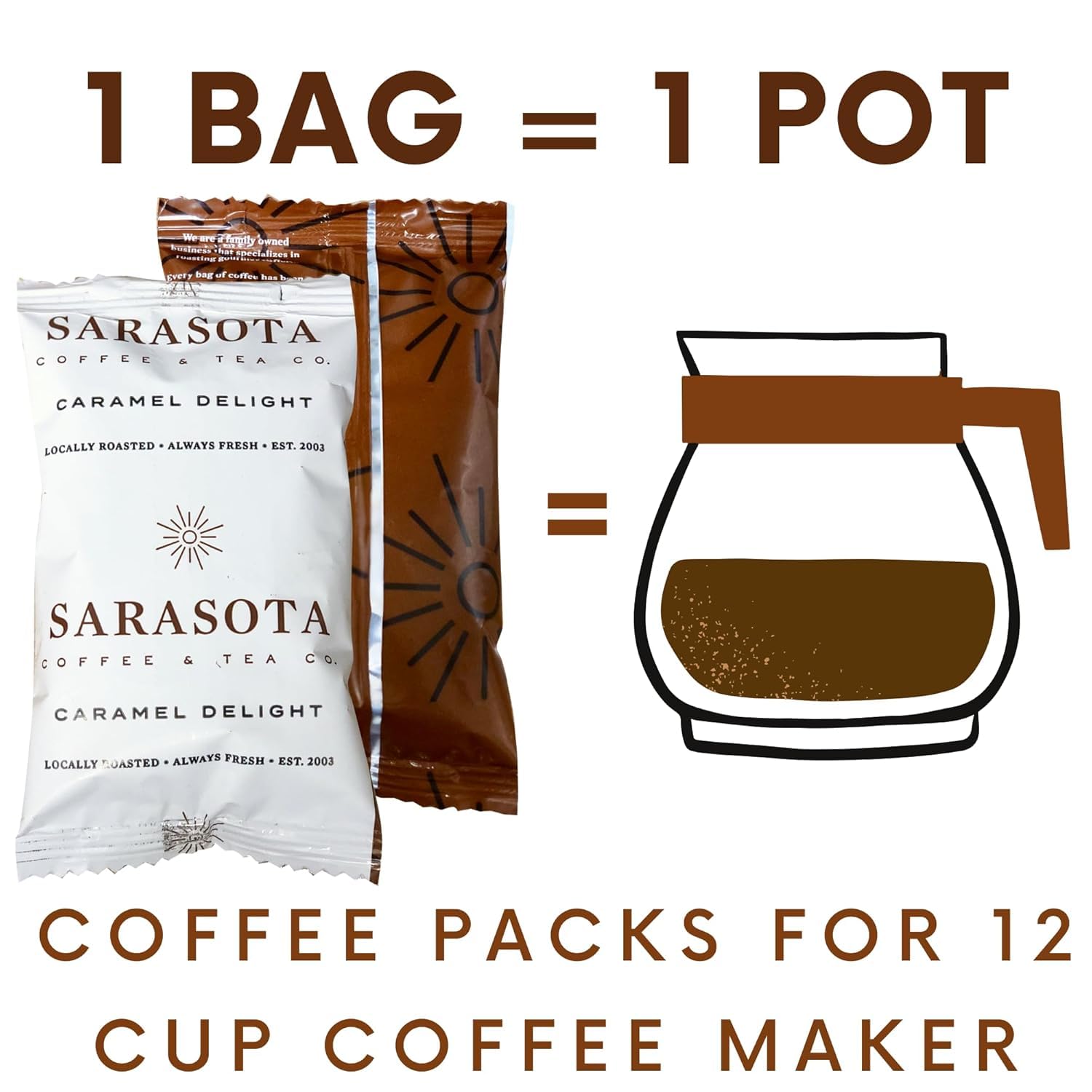 - PRE MEASURED CONVENIENCE - Each individual caramel packet is for a 12 cup drip coffee maker to make a single pot. The caramel delight pre measured bags keep your coffee fresh for over a year, ensuring each sip will be a silk smooth luxe experience.