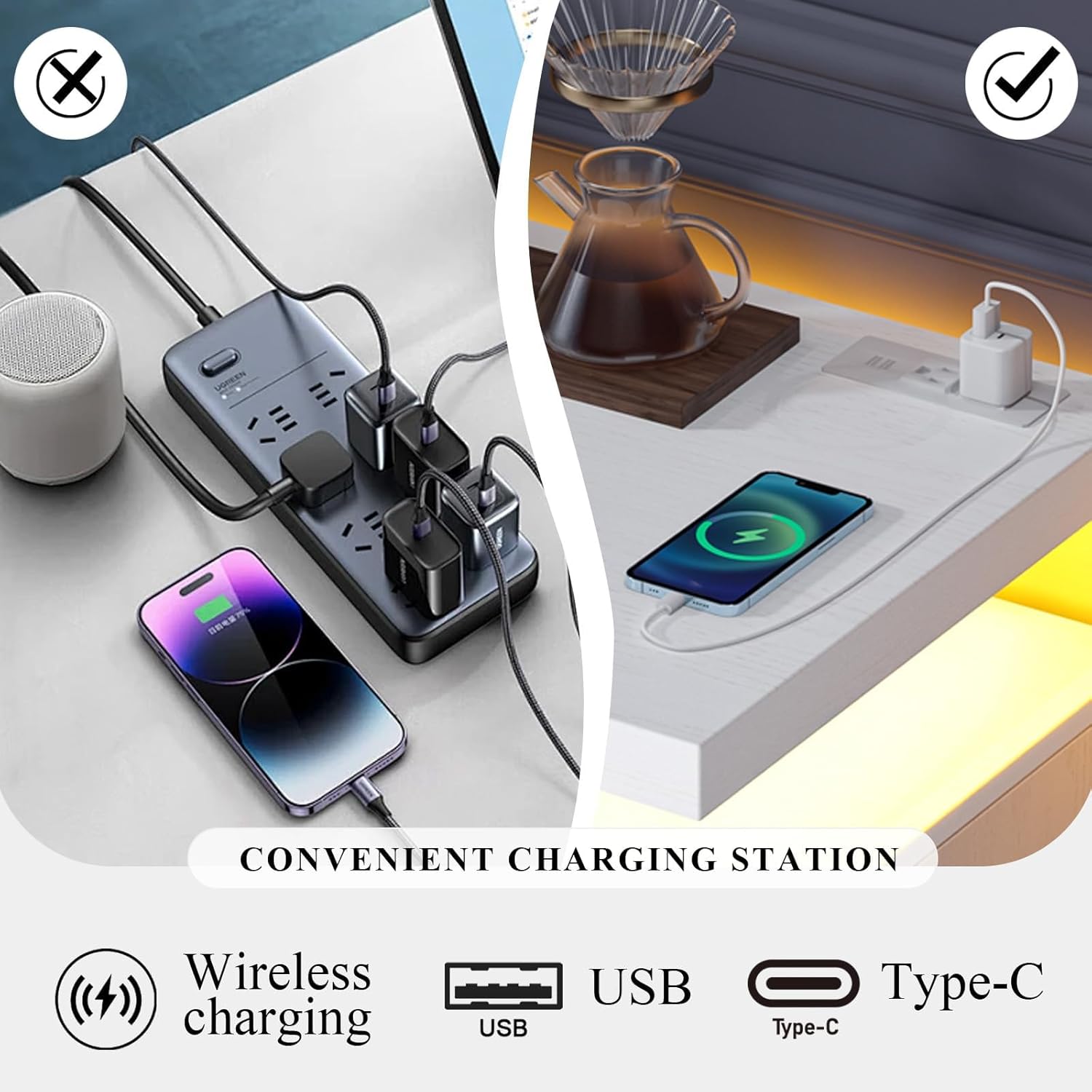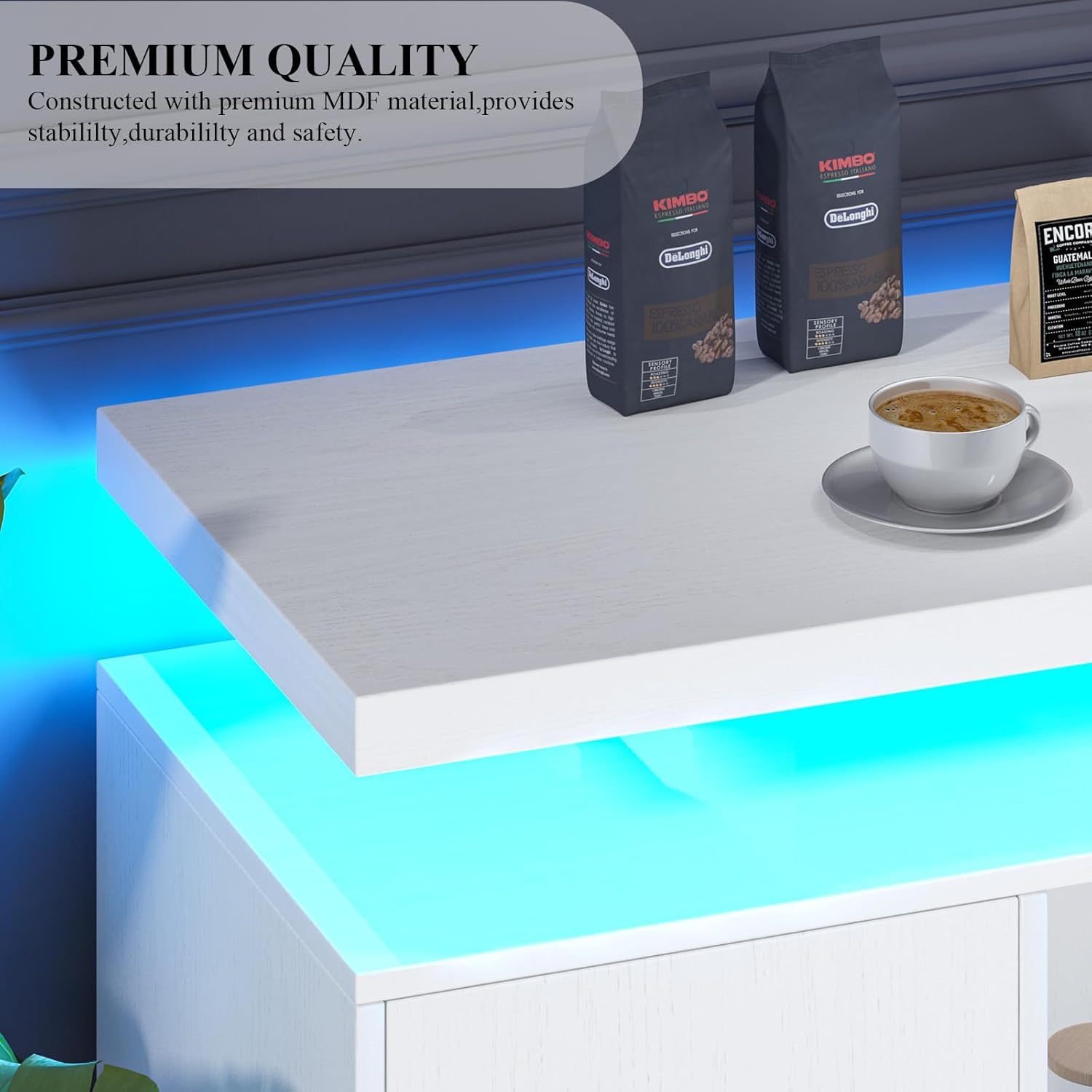 - Unique and Distinctive Floating Design: Modern coffee bar designed with floating tabletop and atmosphered 16 LED lights will fully meets your fantasy of modern style coffee bar cabinet. Especially at night, soft and gentle lights surrounding the entire coffee station, which makes you feel the desktop is floating in the air. White wood-grain material combined with black handles achieve its beauty of contrast.