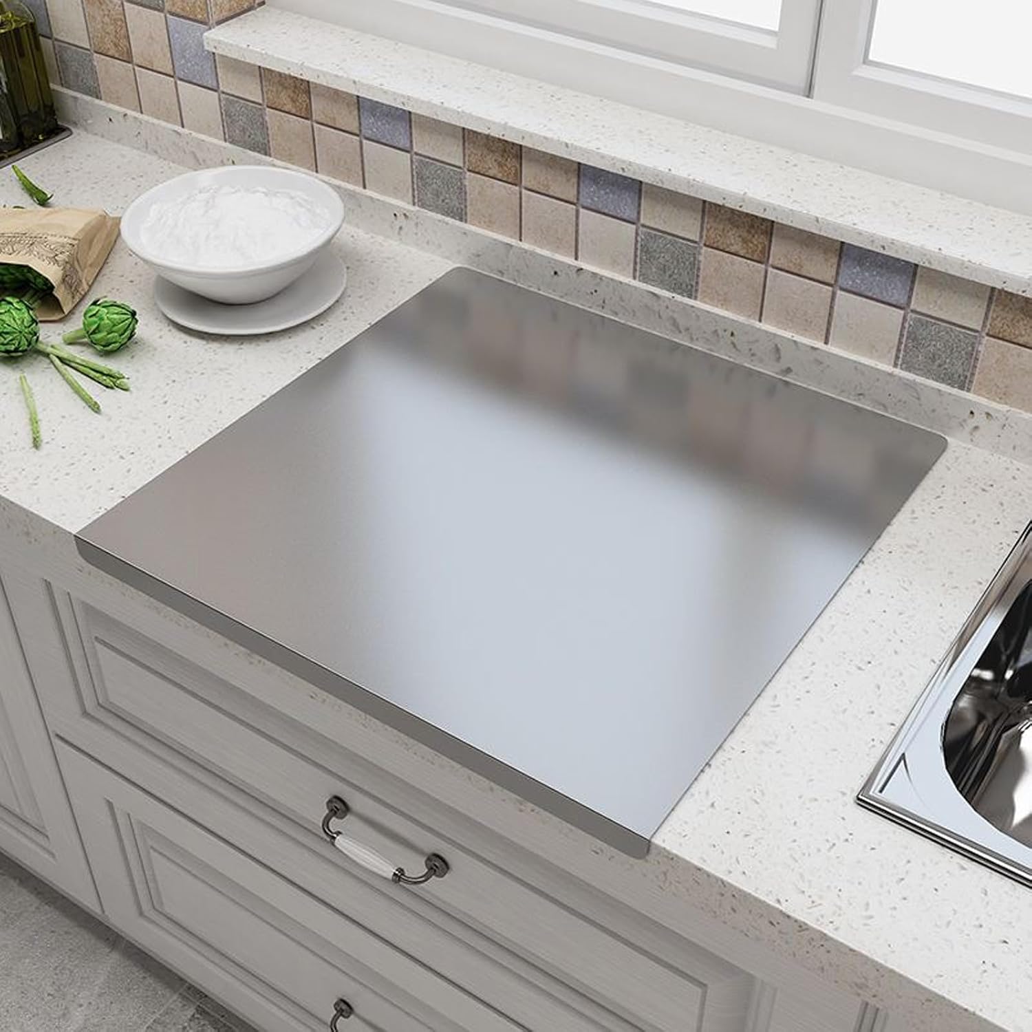 Stainless Steel Cutting Boards with Lip for Kitchen,Chopping Boards for Countertop,Large Metal Cutting Board over Sink Suitable for Meat, Fruits,Vegetables,Bread,Cake,Pasta,Noodle,Pizza(19.7"*15.7")