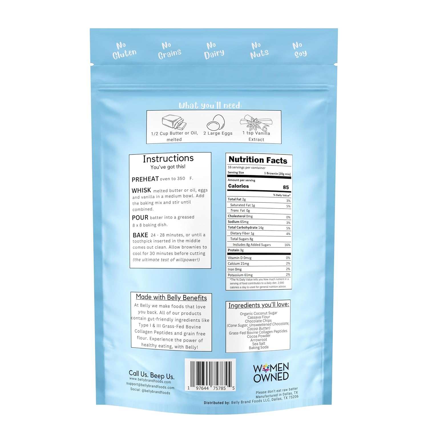 - ALLERGY-FRIENDLY, GUT-FRIENDLY, AND CLEAN INGREDIENTS: Enjoy a guilt-free indulgence with this brownie mix, free from gluten, grains, dairy, soy, and nuts. Belly Brand uses cassava flour, a naturally gluten-free alternative, to achieve a perfect, chewy texture while keeping the ingredients clean and natural. No artificial sweeteners or preservatives here—just wholesome, high-quality ingredients that nourish your body from the inside out.