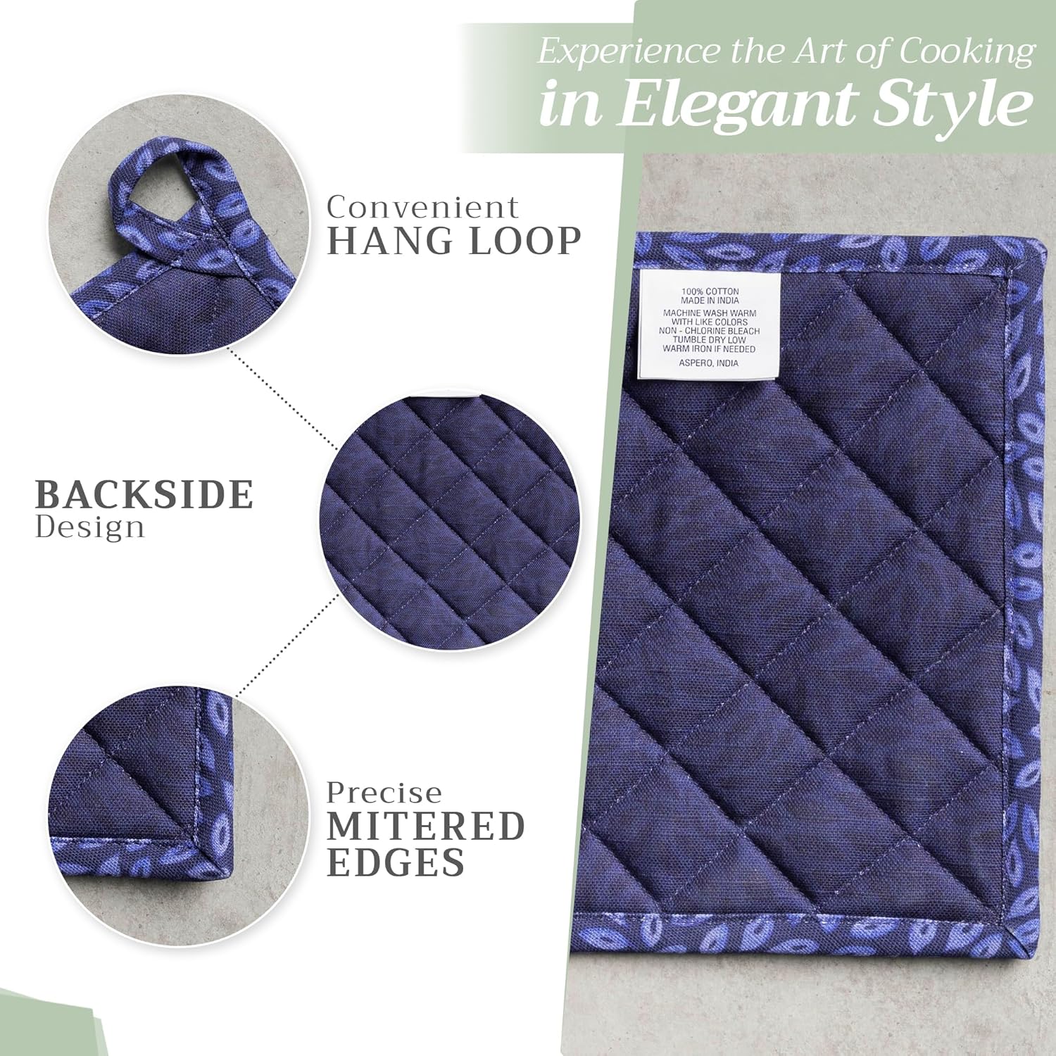 - Package includes: 2 pot holders measures 8"x8". Ideal as a hot pad for dishes, coffee pots, cast iron pans, or cookware. Designed in Europe and Made in India, it blends style, function, and comfort into a daily kitchen essential