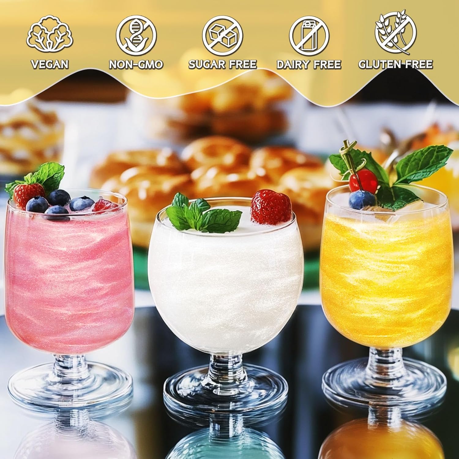 - SAFE AND HIGH-QUALITY INGREDIENTS - Our glitter for drinks is made from 100% edible materials, vegan, non-GMO, unflavored, sugar-free, dairy-free, and gluten-free, ensuring that everyone can enjoy our edible drink glitter safely.