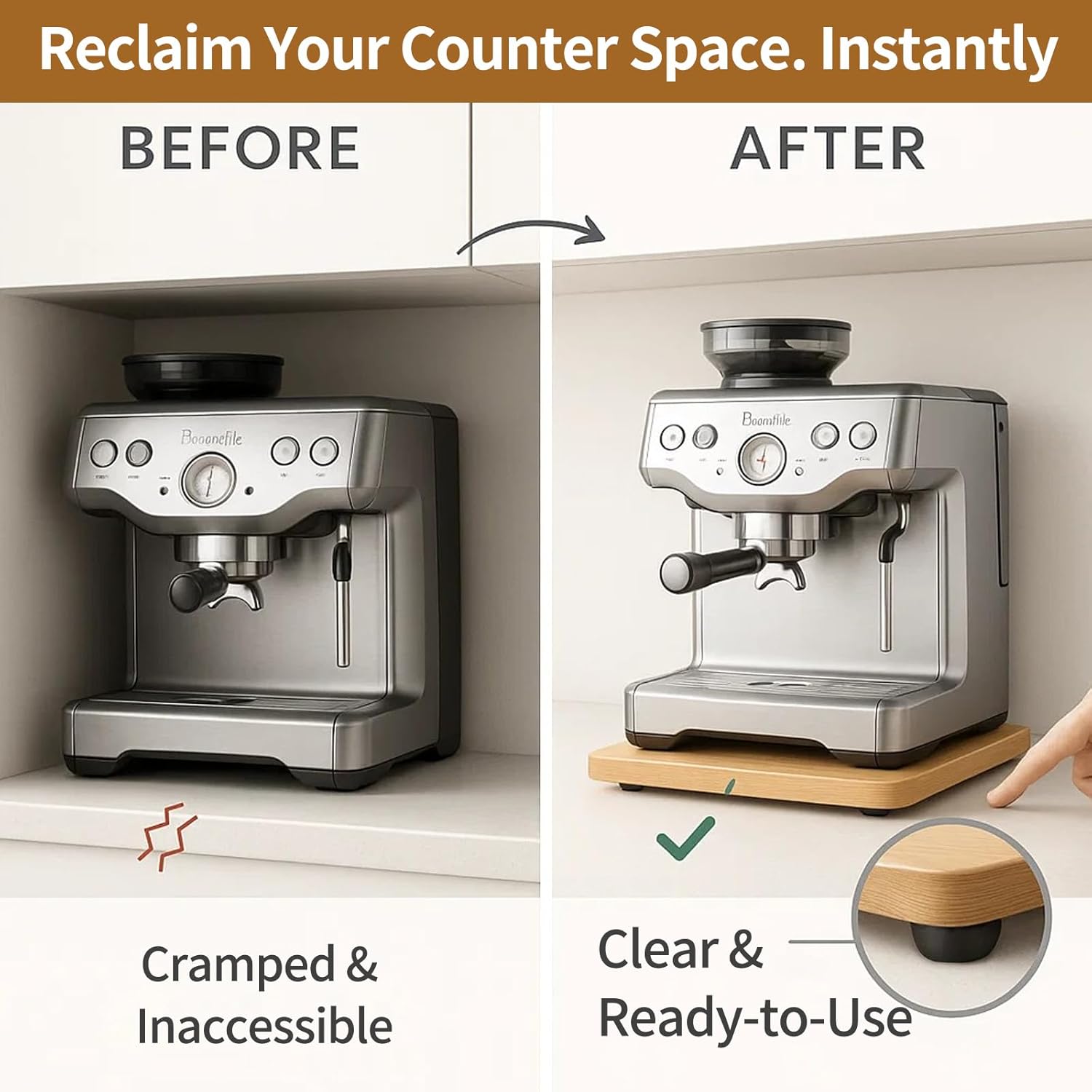 - 【Smooth Rolling for Easy Movement】With smooth-rolling rubber wheels, this sliding tray for coffee maker provides effortless and silent sliding across your countertop or kitchen surfaces without scratching them. Whether you're preparing your morning coffee or clearing space for a grand dinner, our sliding tray makes appliance movement effortless and quick