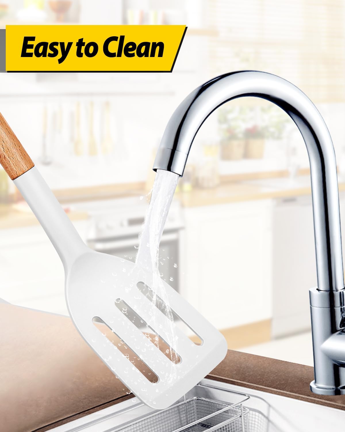 Pack of 2 Silicone Cooking Spatula, Heat Resistant Solid Turner, Non Stick Slotted Spatulas with Wooden Handle,Ideal Wood Kitchen Utensils Set for Frying, Baking, Flipping, Turning (WHITE)