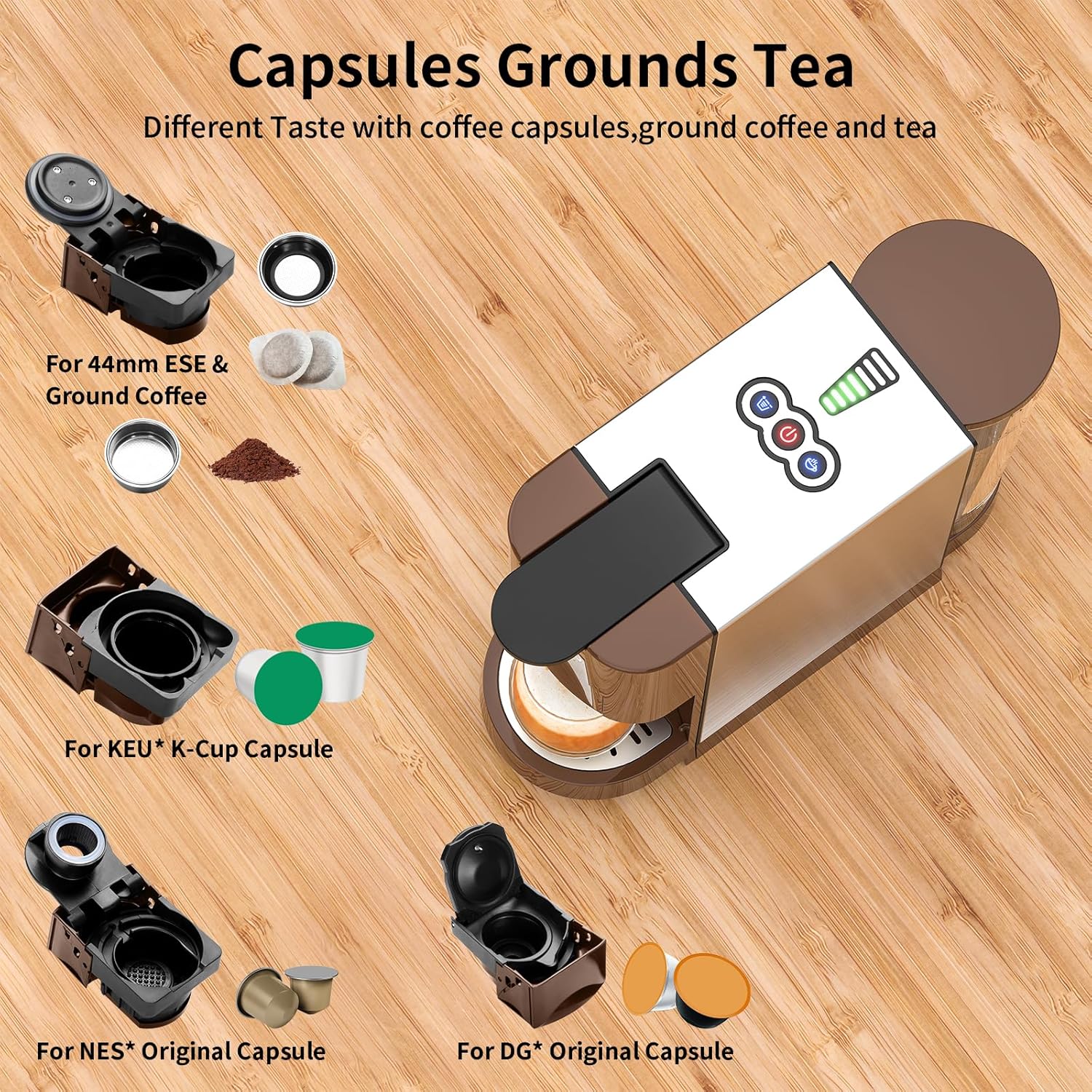 - 5in1 Multicapsules compatible Espresso Maker: Kotlie AC-513HF Espresso Machines(pods that already in package) are compatible with KEU*K*Cup Capsule/NES*Original Capsule/DG capsule/Ground Coffee powder/44mm ESE tea bag. If you want to taste other kinds of capsules, please purchase other compatible pods from Kotlie directly