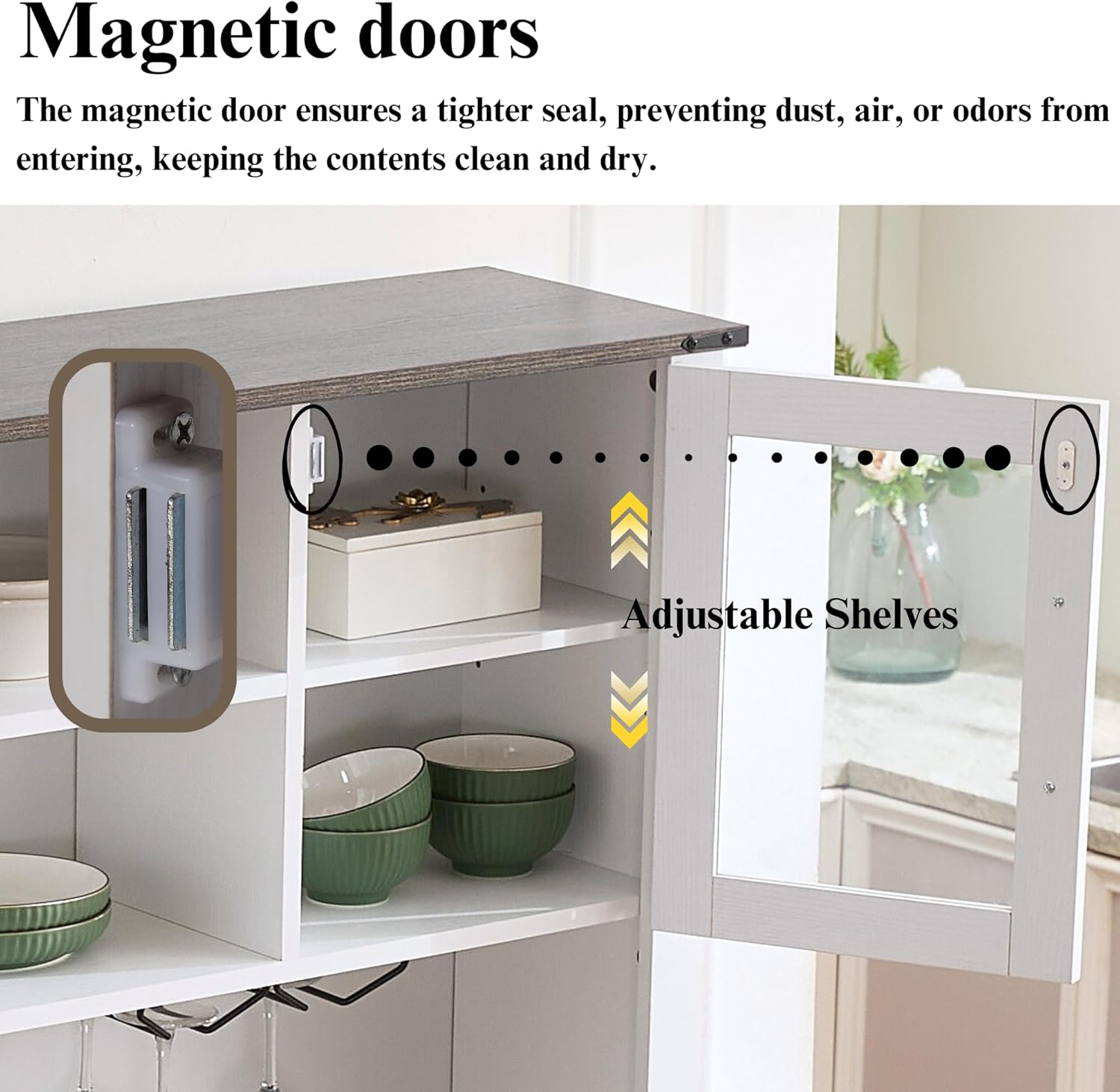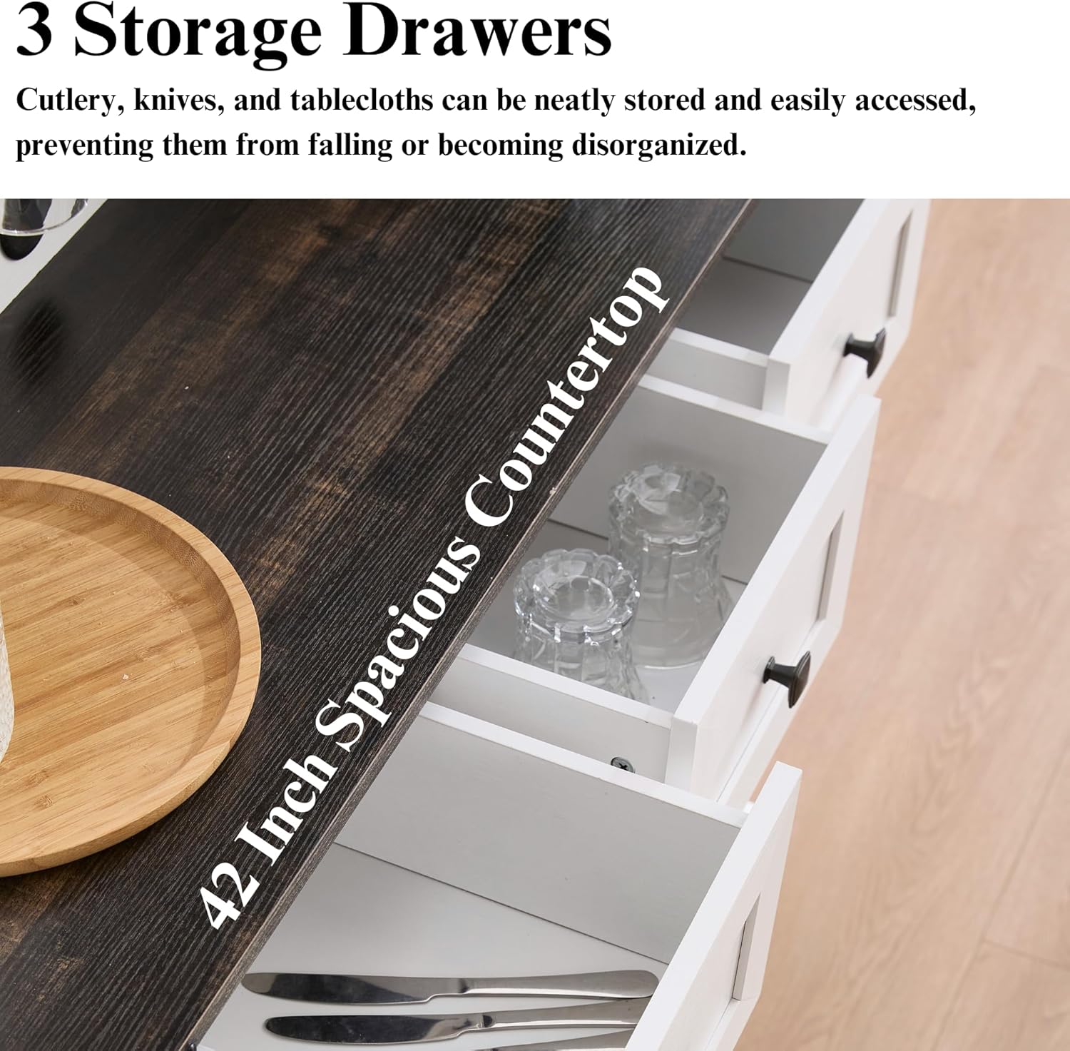 - Ample Storage- This kitchen sideboard offers ample storage. The generous tabletop fits kitchen appliances, while 3 drawers store knives and cutlery. The 4-door storage cabinet has adjustable shelves with 3 height options for flexible storage. Aesthetically pleasing and practical, it enhances space utilization in the kitchen or dining room