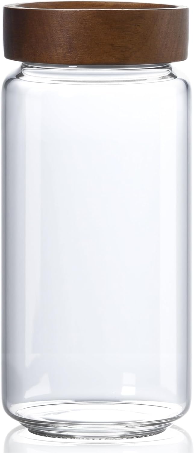 - VERSATILE & MODERN AESTHETIC: The jar is perfect for storing dry goods like flour, cereal, spices, and snacks, as well as liquids like juices and pickles. Its sleek glass body and retro acacia wood lid add a stylish touch, making it a versatile and decorative addition to kitchens, pantries, restaurants, and more.