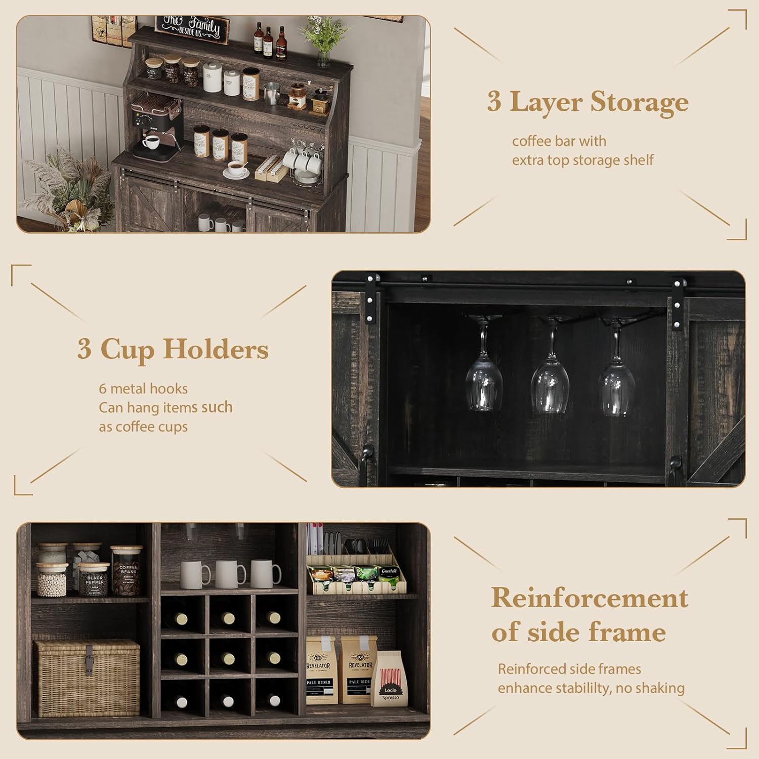 - [Multifunctional Storage Design] The coffee cabinet features 9 wine racks, 3 glass holders, 6 hooks to store and display wine utensils/coffee cups/tea sets, creating a warm family coffee bar and wine bar