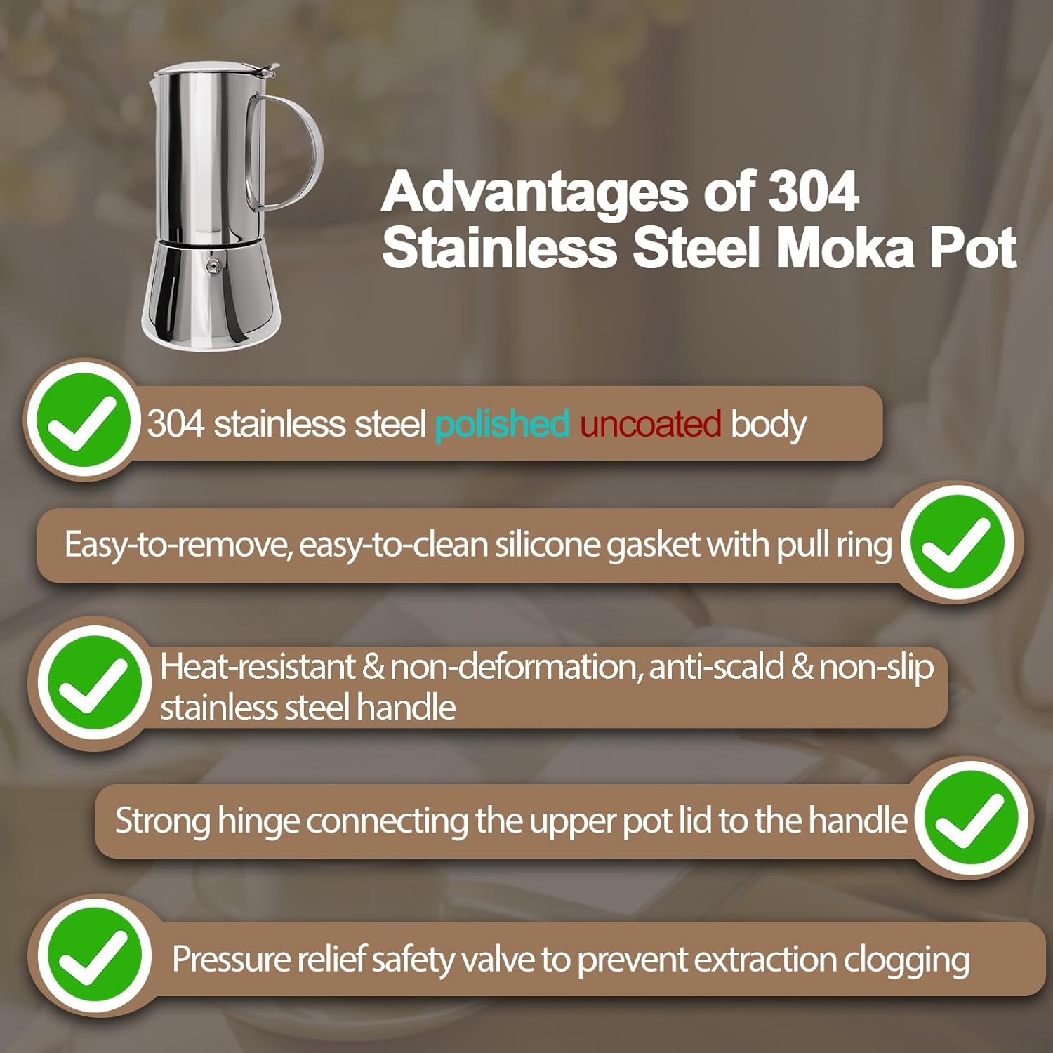 • Uncoated 304 Stainless Steel Material: Made of thickened 304 stainless steel with an uncoated fine polish finish for a smooth and bright appearance. With excellent heat conductivity and durability, it is not easy to be deformed or damaged, and can be used for a long time and repeatedly cleaned, greatly extending its service life. It also absorbs and transfers heat to the pot quickly and evenly, and is compatible with most stoves, ensuring that the coffee extraction process is efficient and stable, and every drop is full of mellow flavor